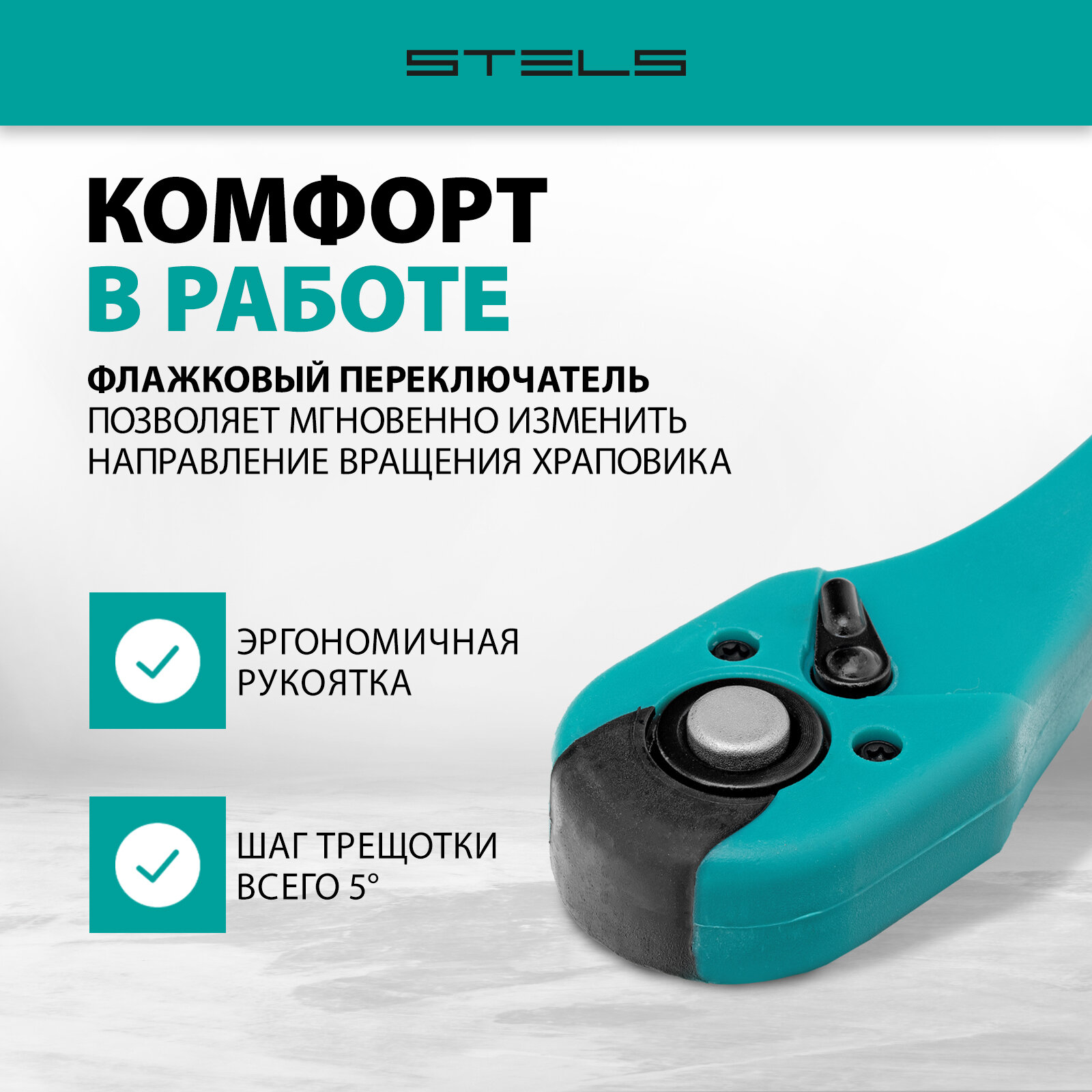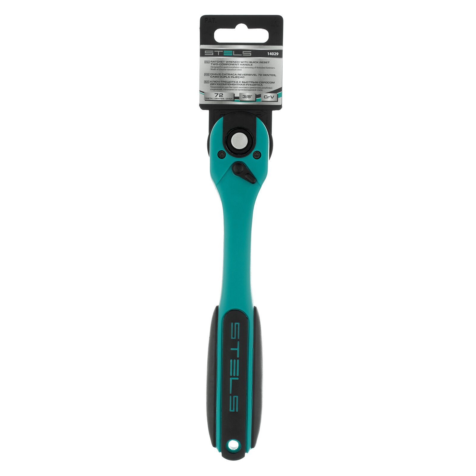 Ключ-трещотка Stels из стали CrV, с присоединительным квадратом 3/8" и 72-зубым храповым механизмом, с быстрым сбросом и 2-компонентной рукояткой, используется для работы с резьбовыми соединениями. Предназначен для установки торцевых головок, а также адаптеров и удлинителей с посадочным отверстием соответствующего размера. Храповой механизм обеспечивает исключительную плавность хода. Инструмент удобен для работы в стесненных условиях, т.к. шаг трещотки составляет всего 5°. Будет полезен в сервисном центре, на СТО, а также пригодится дома или в поездке.