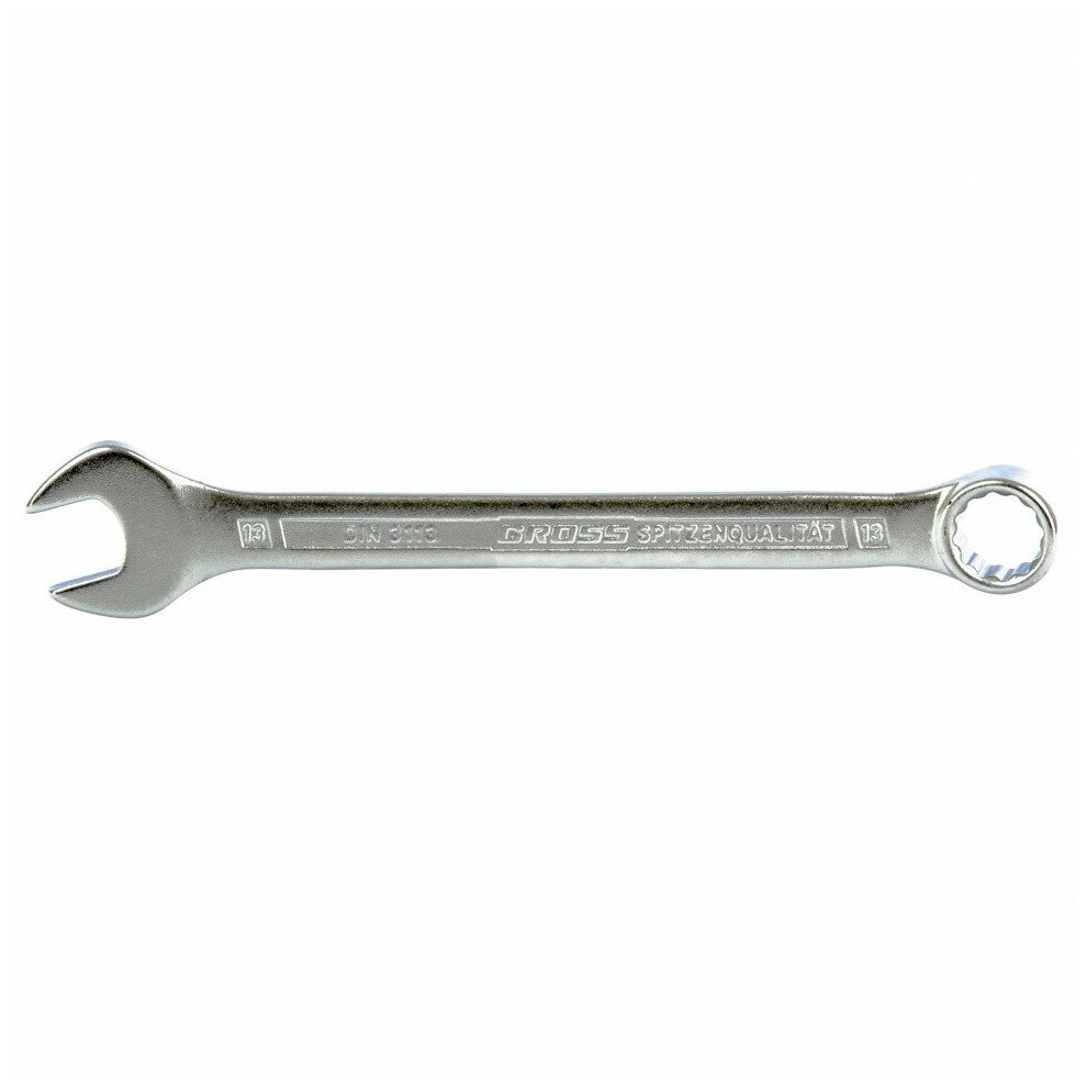 Ключ комбинированный торговой марки GROSS предназначен для монтажа/демонтажа резьбовых соединений. Изготовлен из высококачественной хромованадиевой (Crv) стали методом холодного штампа.Твердость 45-48 HRC. Ключ с одной стороны оснащен захватом открытого типа рожковым и накидным (кольцевым) с другой стороны. Профиль кольцевого зева имеет 12 граней, что увеличивает площадь соприкосновения рабочих поверхностей и снижает риск деформации граней крепежа при монтаже. Угол наклона кольцевого зева относительно плоскости ключа в 15 градусов делает монтаж более удобным. Хромоникелевое покрытие ключа улучшает антикоррозийные свойства инструмента.