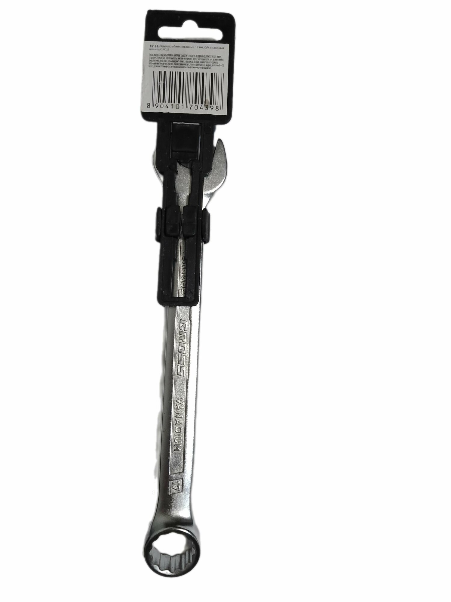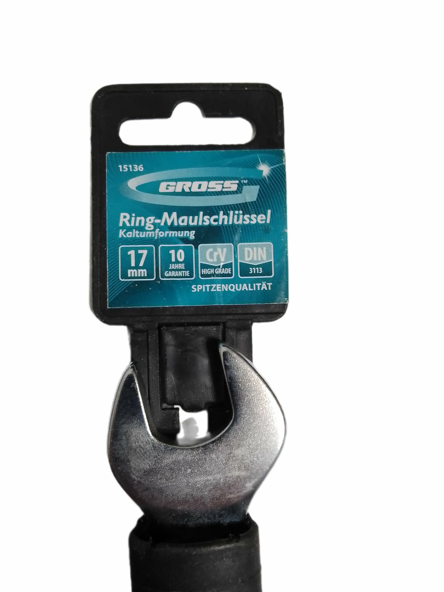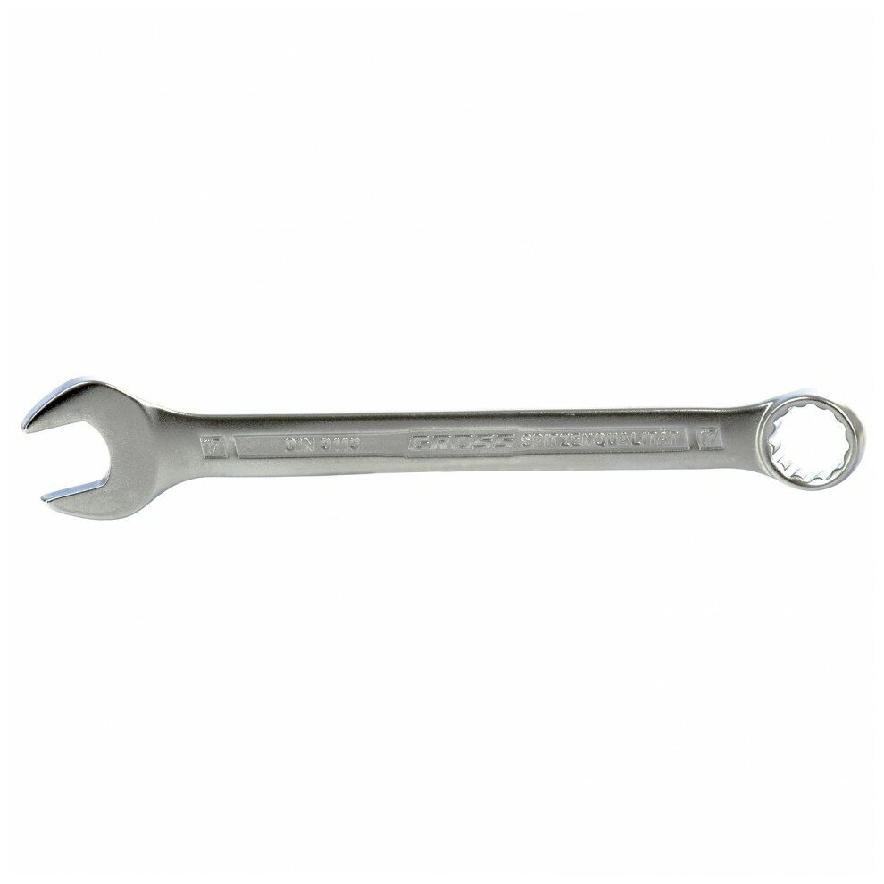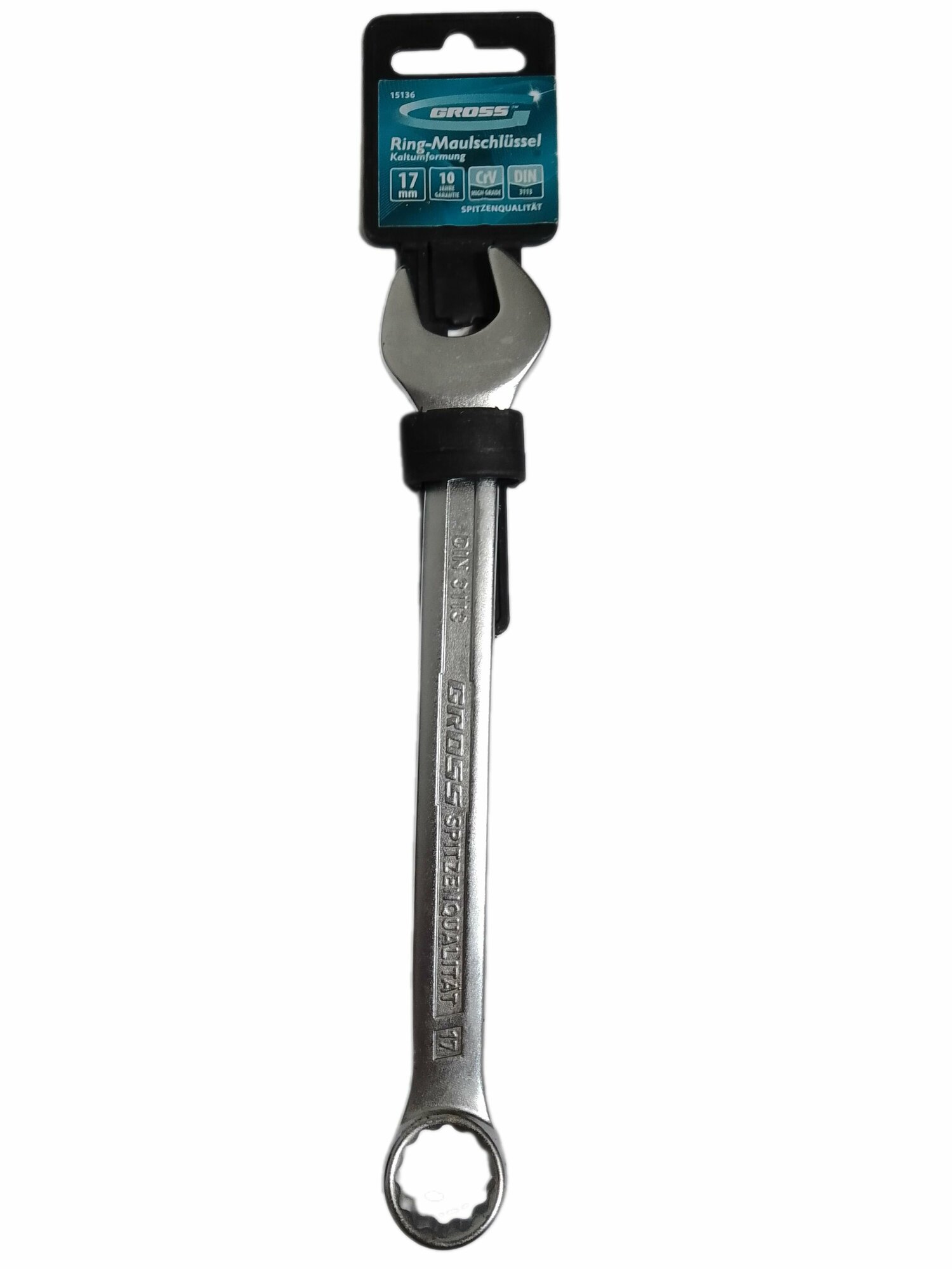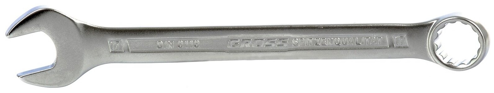 Ключ комбинированный торговой марки GROSS предназначен для монтажа/демонтажа резьбовых соединений. Изготовлен из высококачественной хромованадиевой (Crv) стали методом холодного штампа. Твердость 45-48 HRC. Ключ с одной стороны оснащен захватом открытого типа - рожковым и накидным (кольцевым) с другой стороны. Профиль кольцевого зева имеет 12 граней, что увеличивает площадь соприкосновения рабочих поверхностей и снижает риск деформации граней крепежа при монтаже. Угол наклона кольцевого зева относительно плоскости ключа в 15 градусов делает монтаж более удобным. Хромоникелевое покрытие ключа улучшает антикоррозийные свойства инструмента.