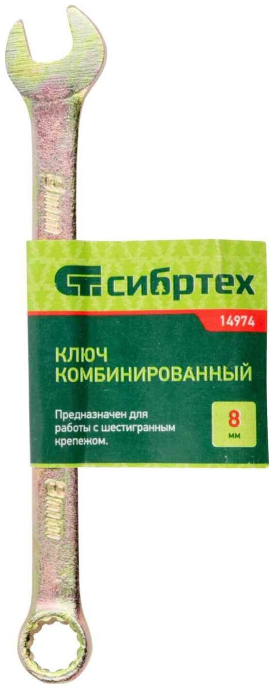 Комбинированный ключ 8 мм СИБРТЕХ предназначается для выполнения монтажных/демонтажных работ с использованием резьбовых соединений, имеющих шестигранный рабочий профиль. Инструмент сочетает в себе два вида головок - открытую и кольцевую. Их рабочие поверхности обладают высокой твердостью, соответствующей ГОСТ. Изделие прослужит долгие годы благодаря желтому цинковому покрытию, препятствующему появлению коррозии.