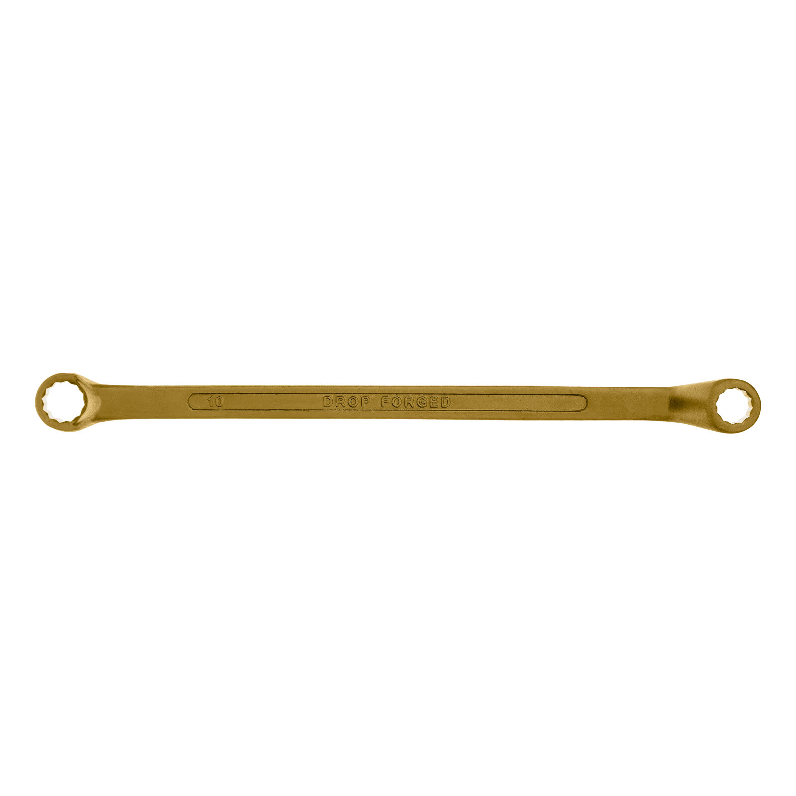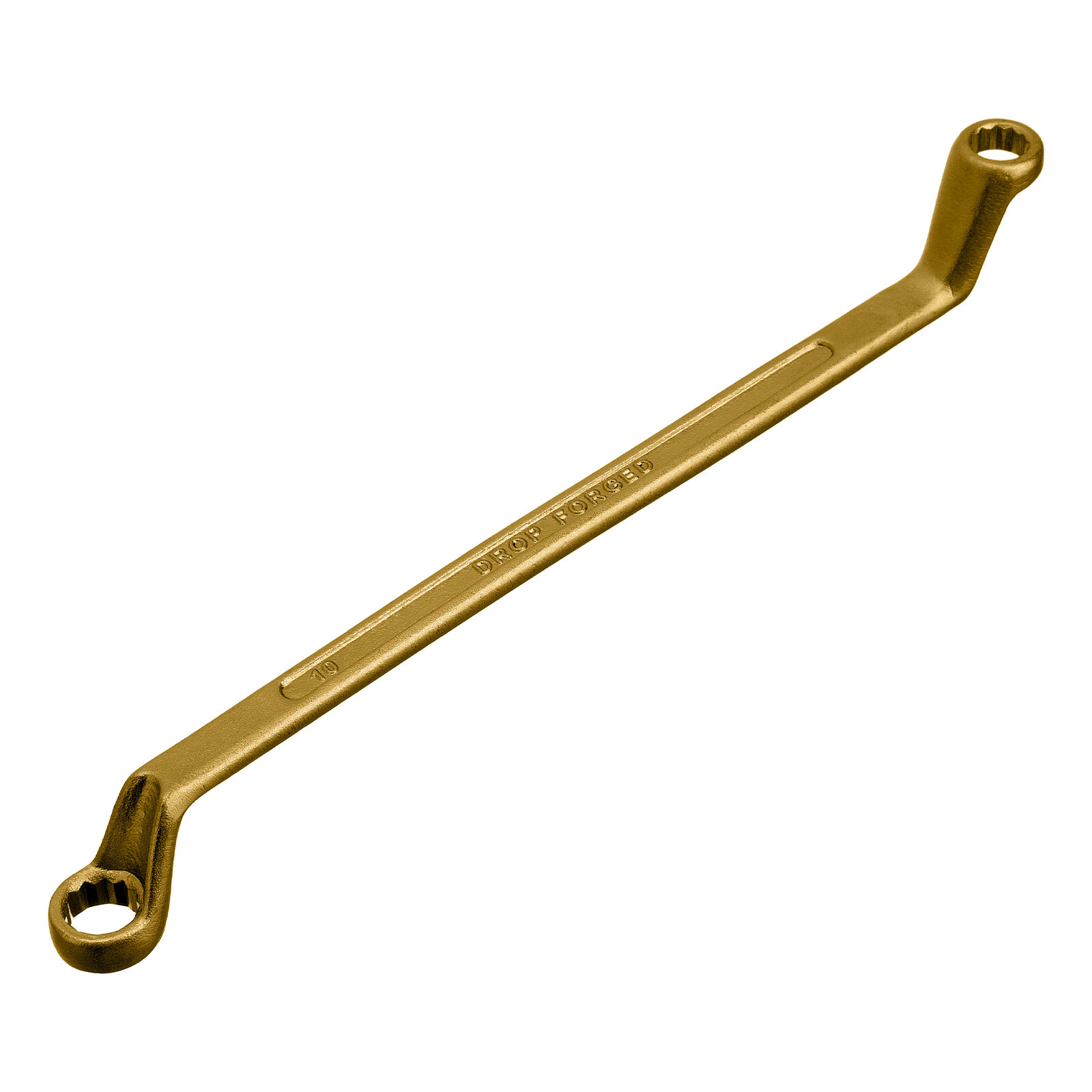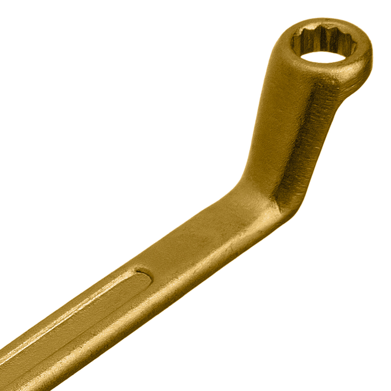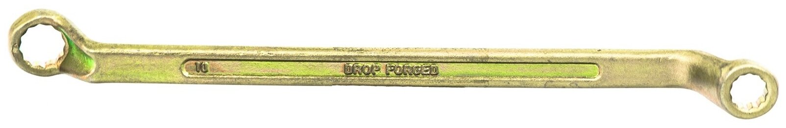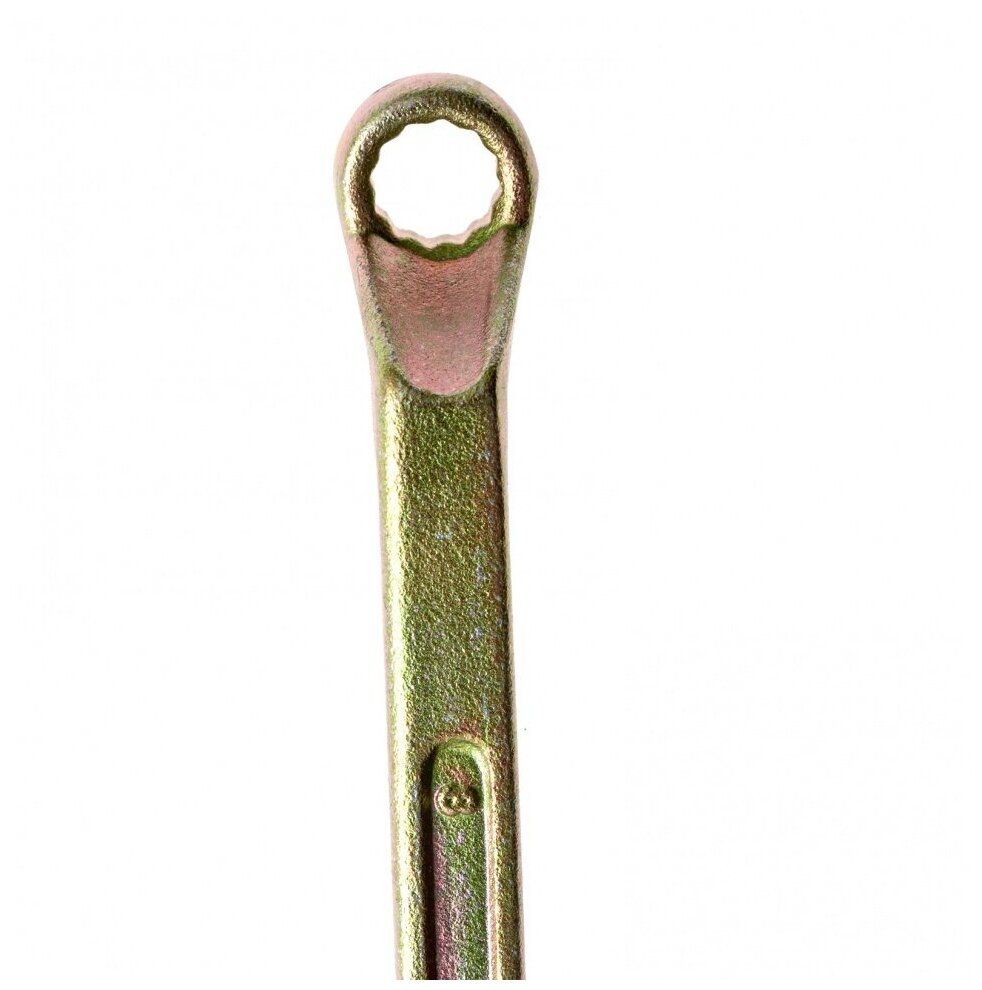 Ключ гаечный коленчатый имеет два кольцевых зева разных размеров. Профиль кольцевого зева имеет 12 граней, что увеличивает площадь соприкосновения рабочих поверхностей и снижает риск деформации граней крепежа при монтаже. Накидные рабочие части ключа смещены относительно его рукоятки, что позволяет работать в труднодоступных местах. Изготовлен из углеродистой стали. Твердость материала рабочей части ключа 42 HRc (требования ГОСТ – 41–46 HRc). Ключ имеет антикоррозионное покрытие из желтого цинка. Ключ гаечный коленчатый предназначен для монтажа демонтажа резьбовых соединений.