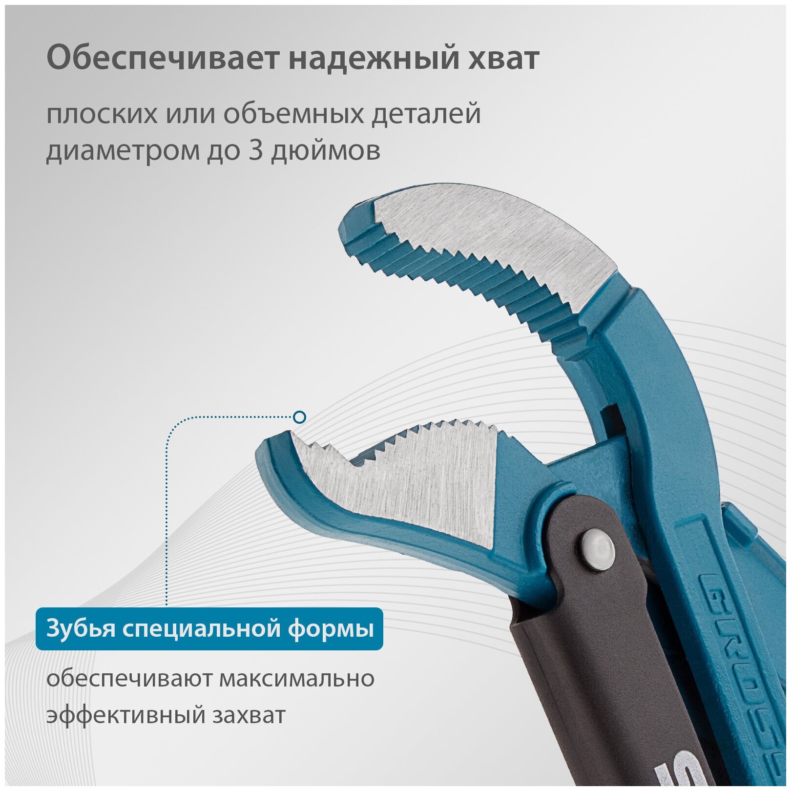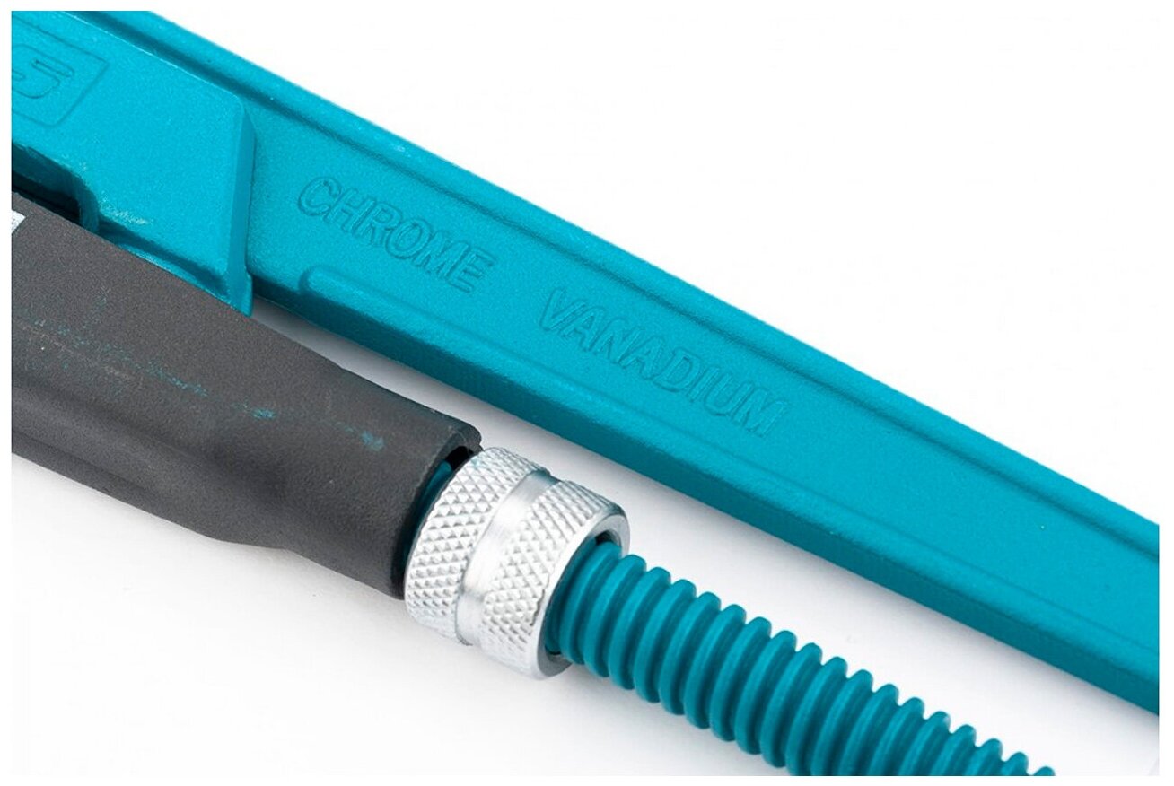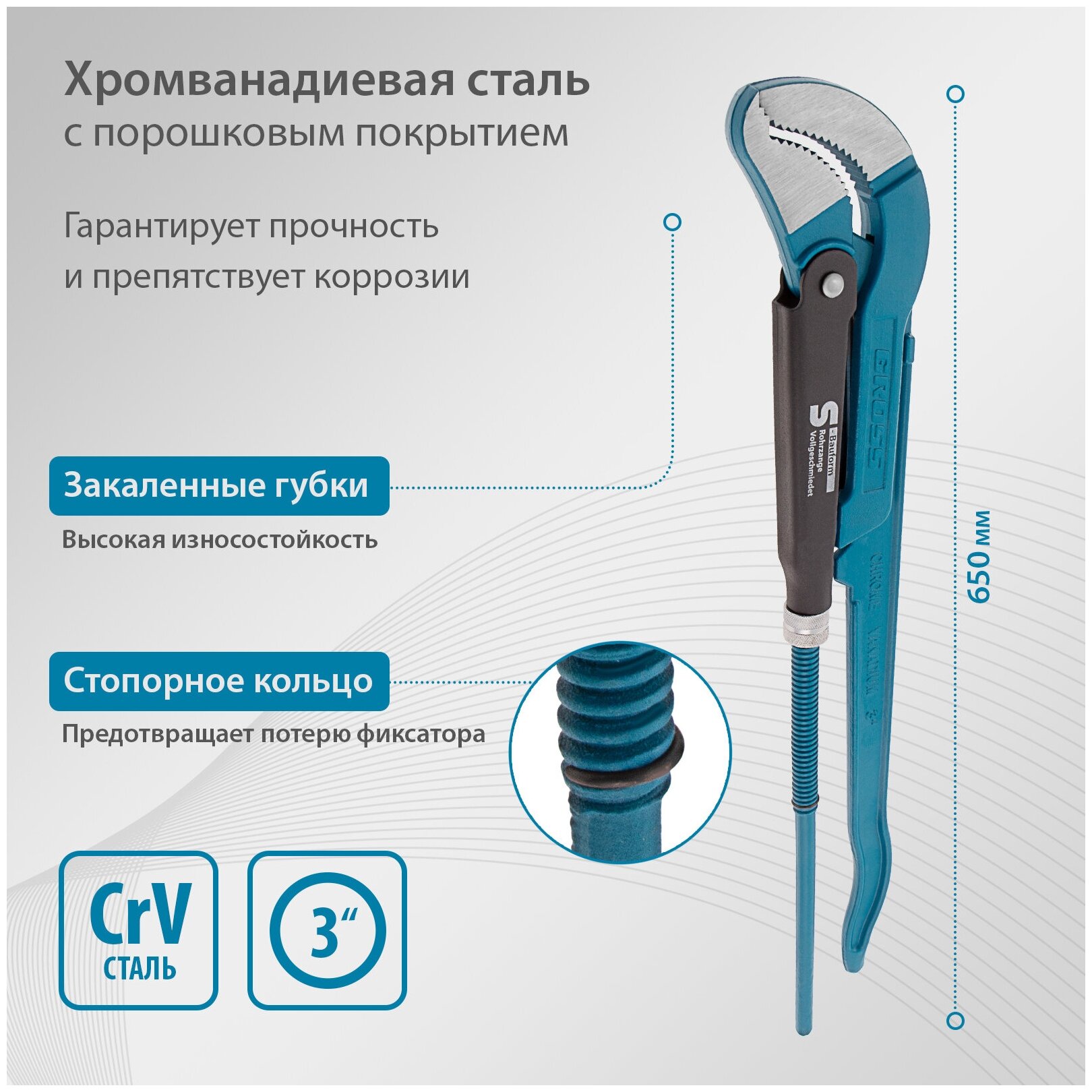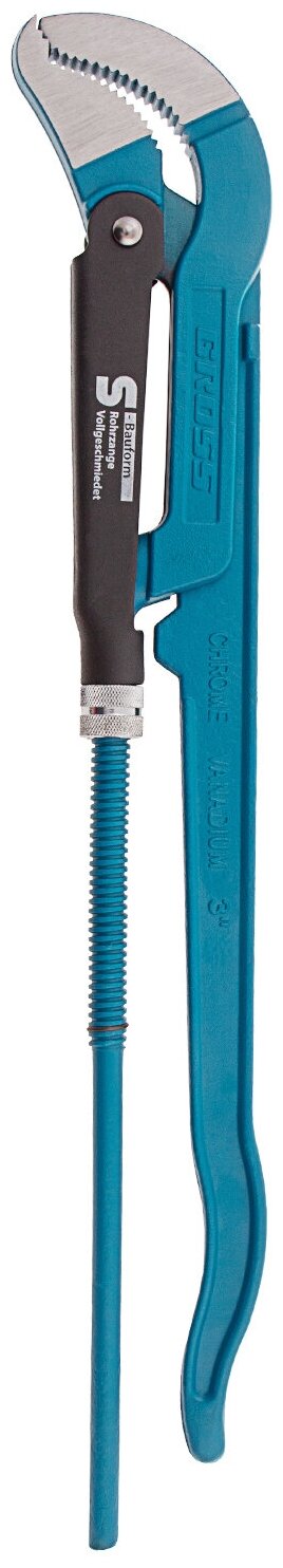 | Прочие особенности и свойства | Ключ трубный рычажный типа S усиленной конструкции, применяется при повышенных нагрузках. Предназначен для захватывания и вращения труб и соединительных частей трубопроводов. Изготовлен из высококачественной хромванадиевой стали. Имеет порошковое антикоррозийное покрытие. Губки дополнительно закалены токами высокой частоты до твердости 57-60 HRс. Прогрессивная форма зуба с наклоном против направления вращения обеспечивает самоблокируемый захват деталей. Верхняя ручка имеет выштампованный Т-образный профиль. Регулировочная гайка снабжена стопорным кольцом. |