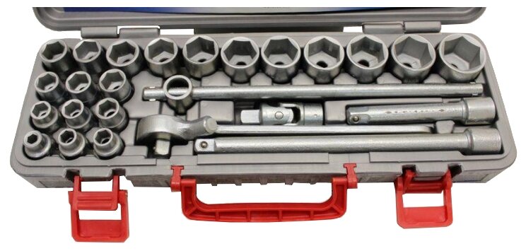 | Комплектация | трещоточный ключ, ключ с присоединительным квадратом, удлинители 125,150 мм, коловорот, шарнир, торцевые головки 20 шт. |