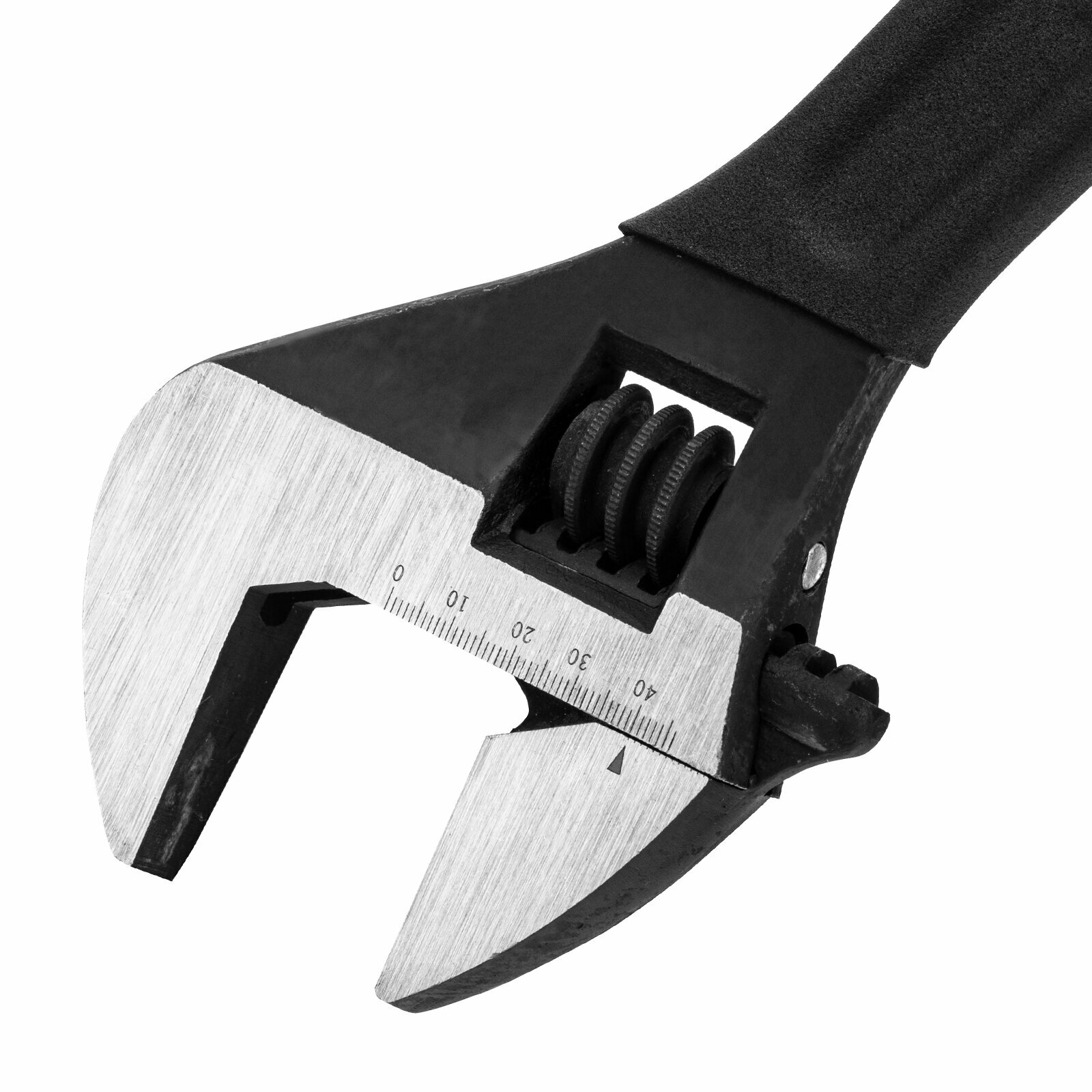 | Прочие особенности и свойства | Разводной ключ предназначен для монтажа и демонтажа резьбовых соединений с широким диапазоном размеров крепежа., Особенности, Изготовлен из углеродистой стали, Селективная закалка, На неподвижной губке нанесена градуировка, а на подвижной – точечная риска, Преимущества, Червячный винтовой механизм имеет фосфатированное покрытие для защиты от коррозии, Позволяет разводить губки на точно заданное растояние, Обливная рукоятка обеспечивает надежный захват инструмента |