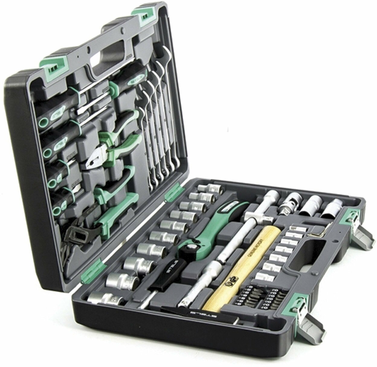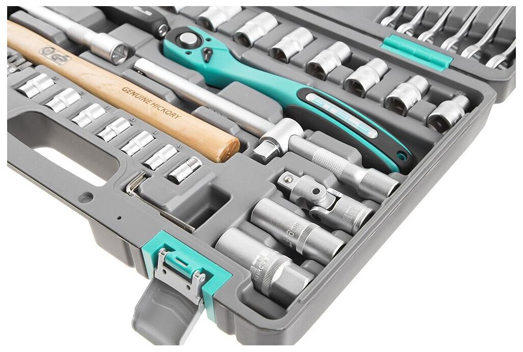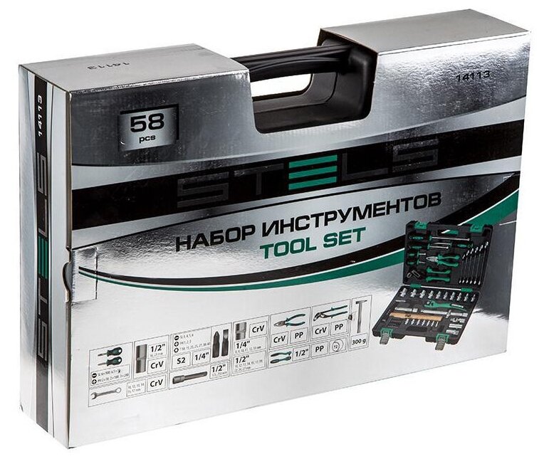 Набор инструментов Stels из 58 предметов. Наборы инструмента торговой марки STELS разработаны специально для автолюбителей и центров технического обслуживания. Каждый этап производства контролируется в соответствии с международными стандартами. Головки и комбинированные ключи изготовлены из хромованадиевой стали, придающей инструменту исключительную твердость в сочетании с легкостью. Биты, биты-вставки и отвёртки производятся из стали S2, улучшающей свойства инструмента.