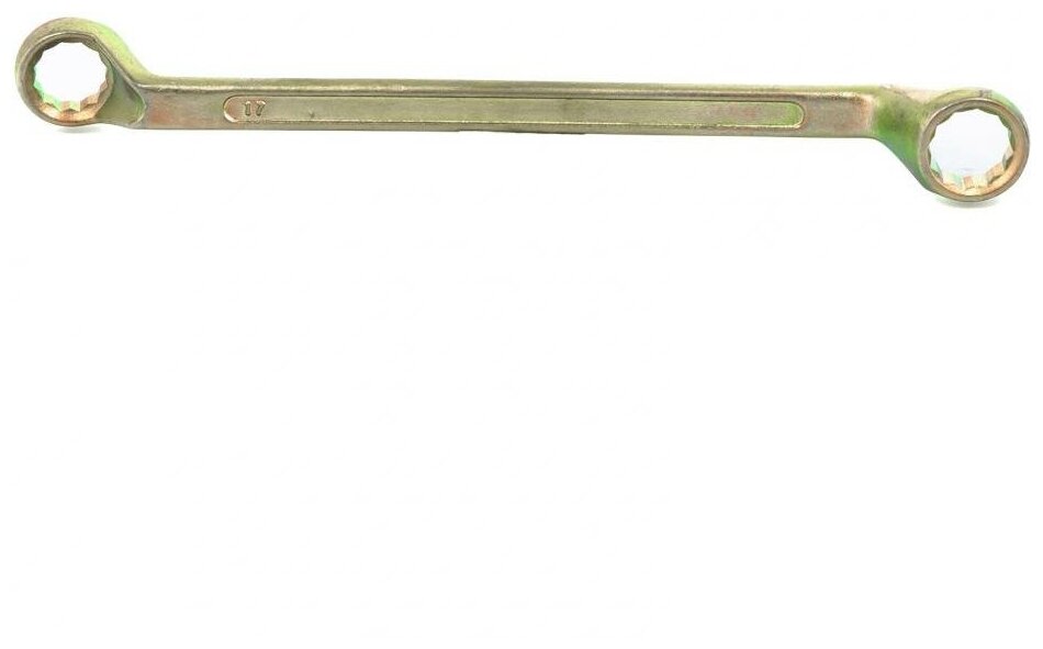 Ключ гаечный коленчатый имеет два кольцевых зева разных размеров. Профиль кольцевого зева имеет 12 граней, что увеличивает площадь соприкосновения рабочих поверхностей и снижает риск деформации граней крепежа при монтаже. Накидные рабочие части ключа смещены относительно его рукоятки, что позволяет работать в труднодоступных местах. Изготовлен из углеродистой стали. Твердость материала рабочей части ключа 42 HRc (требования ГОСТ – 41–46 HRc). Ключ имеет антикоррозионное покрытие из желтого цинка. Ключ гаечный коленчатый предназначен для монтажа демонтажа резьбовых соединений.