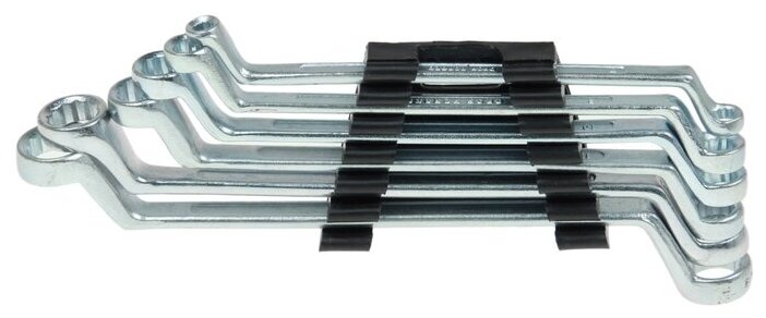 | Прочие особенности и свойства | Ключи гаечные коленчатые имеют два кольцевых зева разных размеров. Профиль кольцевого зева имеет 12 граней, что увеличивает площадь соприкосновения рабочих поверхностей и снижает риск деформации граней крепежа при монтаже. Накидные рабочие части ключа смещены относительно его рукоятки, что позволяет работать в труднодоступных местах. Изготовлен из углеродистой стали. Твердость накидной рабочей части – 41 HRc (требования ГОСТ – 41–46 HRc). Ключи имеют надежное антикоррозионное покрытие из хрома. Ключи упакованы в полиэтилен. Набор предназначен для монтажа демонтажа резьбовых соединений. |