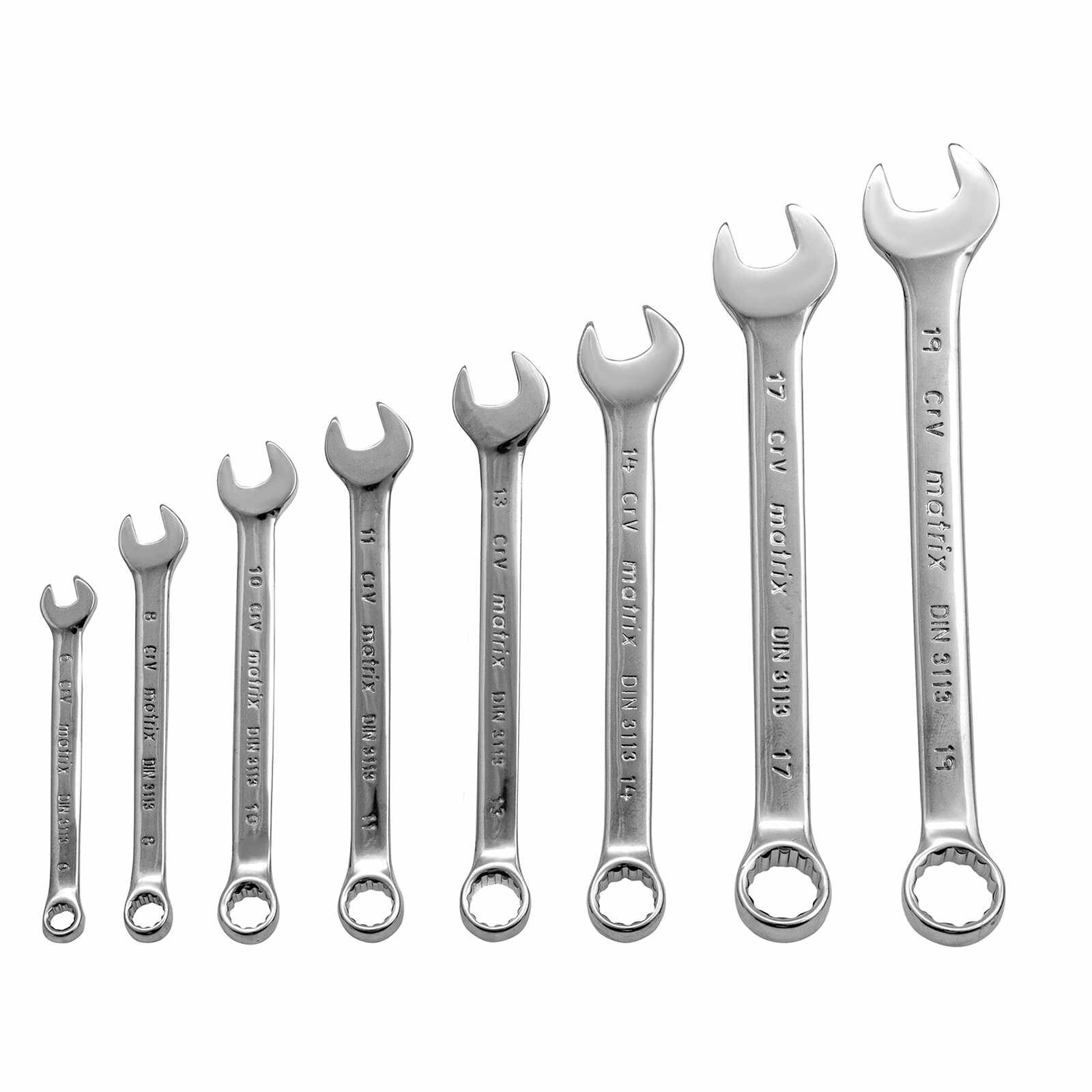 | Прочие особенности и свойства | Прочные корпуса из хромованадиевой стали; Твердость материала рабочей части составляет 45 HRc (требования ГОСТ:45-51 HRc); Защитное матовое хромоникелевое покрытие; В комплекте набора комбинированных ключей 6-19мм, 8шт MATRIX 15422 предусмотрен надежный трапециевидный пластмассовый держатель; Профили кольцевых головок имеют 12 граней; Кольцевые зевы отклонены от плоскости ключей на 15 градусов. |