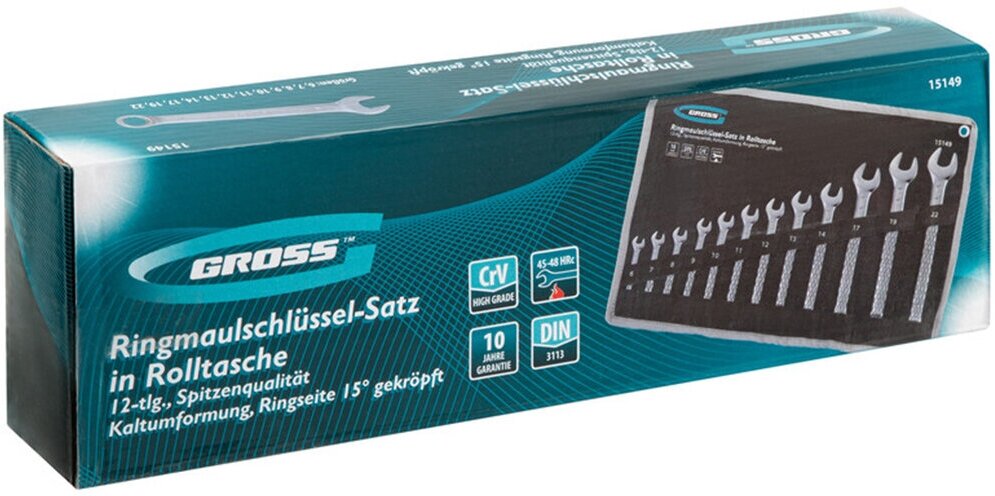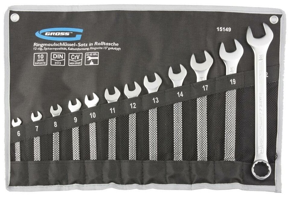 | Прочие особенности и свойства | Набор комбинированных ключей торговой марки GROSS предназначен для монтажа/демонтажа резьбовых соединений. Ключи набора изготовлены из высококачественной хромованадиевой (Crv) стали методом холодного штампа. Твердость 45-48 HRC. В набор входит двенадцать ключей размером от 6 до 22 мм. Каждый ключ с одной стороны оснащен захватом открытого типа — рожковым и накидным (кольцевым) с другой стороны.Профиль кольцевого зева имеет 12 граней, что увеличивает площадь соприкосновения рабочих поверхностей и снижает риск деформации граней крепежа при монтаже. Угол наклона кольцевого зева относительно плоскости ключа в 15 градусов делает монтаж более удобным. Хромоникелевое покрытие ключей улучшает антикоррозийные свойства инструмента. |
