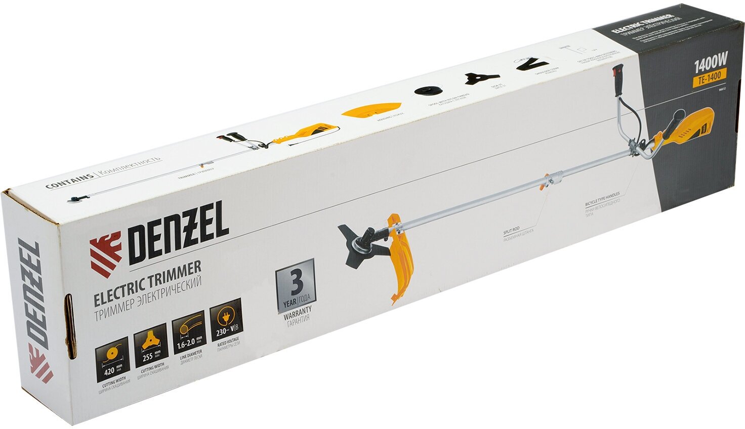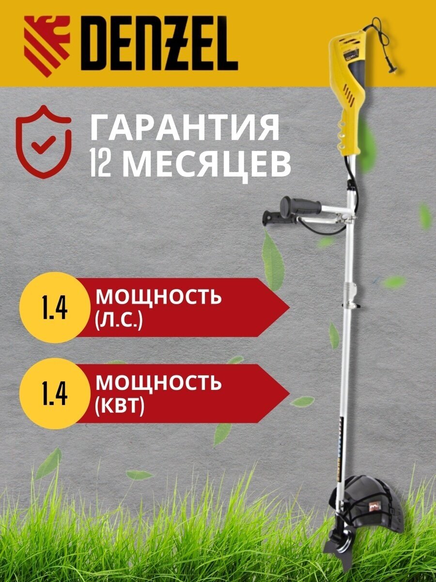 Электрический триммер торговой марки DENZEL предназначен для скашивания травы и молодого кустарника на открытых пространствах. Оптимально использование при выкашивании травы в труднодоступных местах: вдоль кромок дорожек, стен строений, а также вокруг деревьев. Высокую частоту вращения режущей головки обеспечивает электродвигатель мощностью 1400 Вт. За один проход ширина скашивания леской составляет 42 см. При работе с триммером рекомендуется применять леску диаметром 2мм.