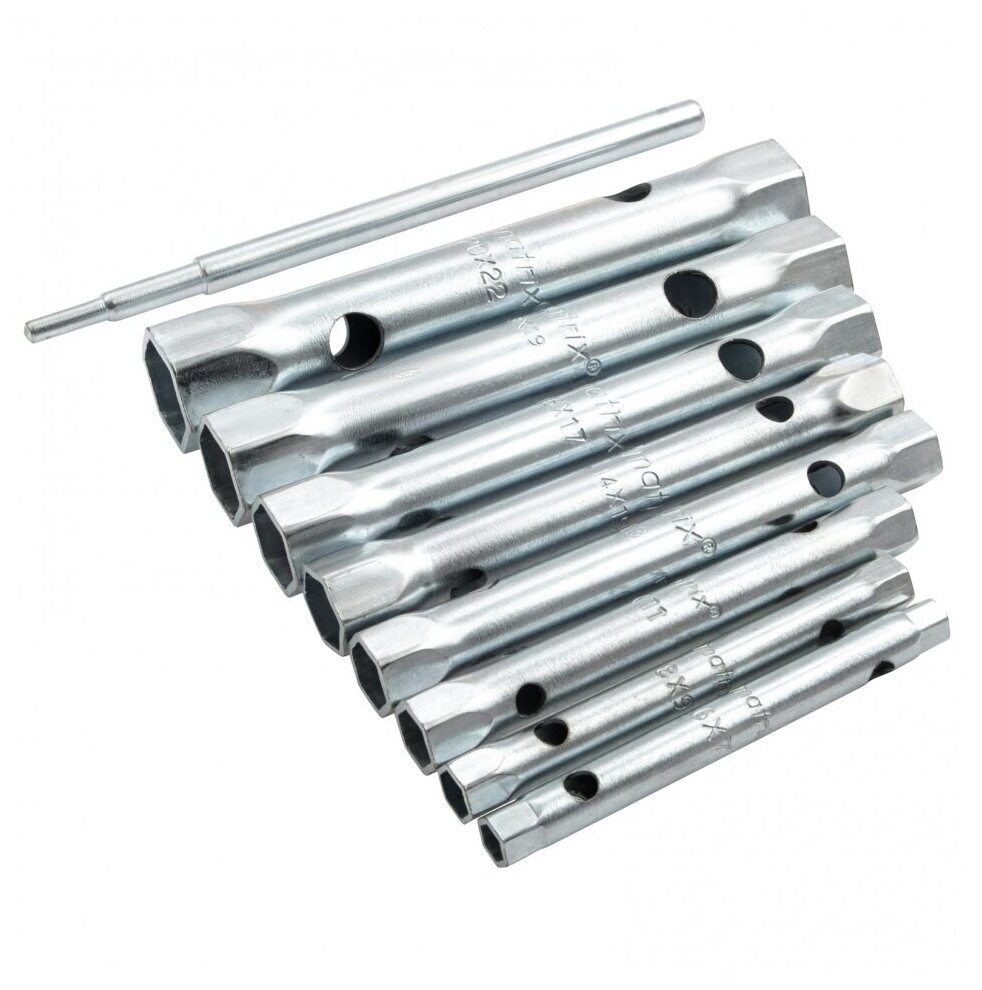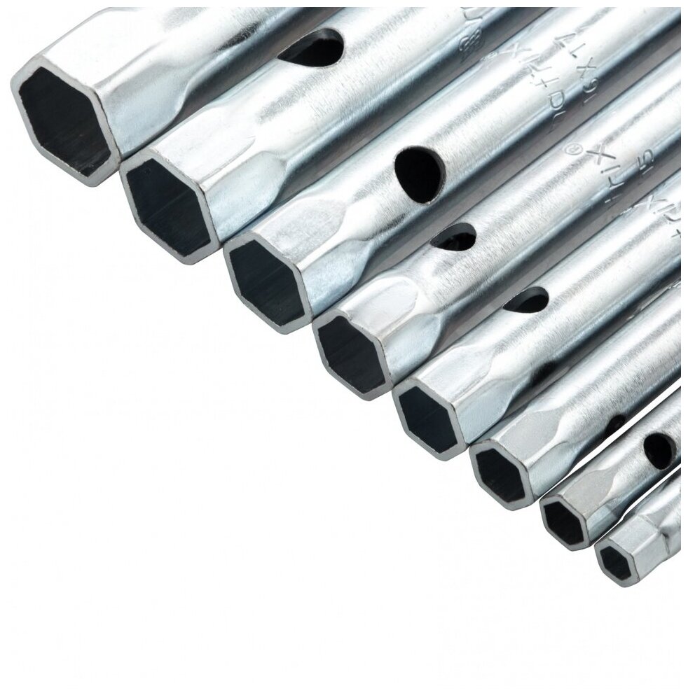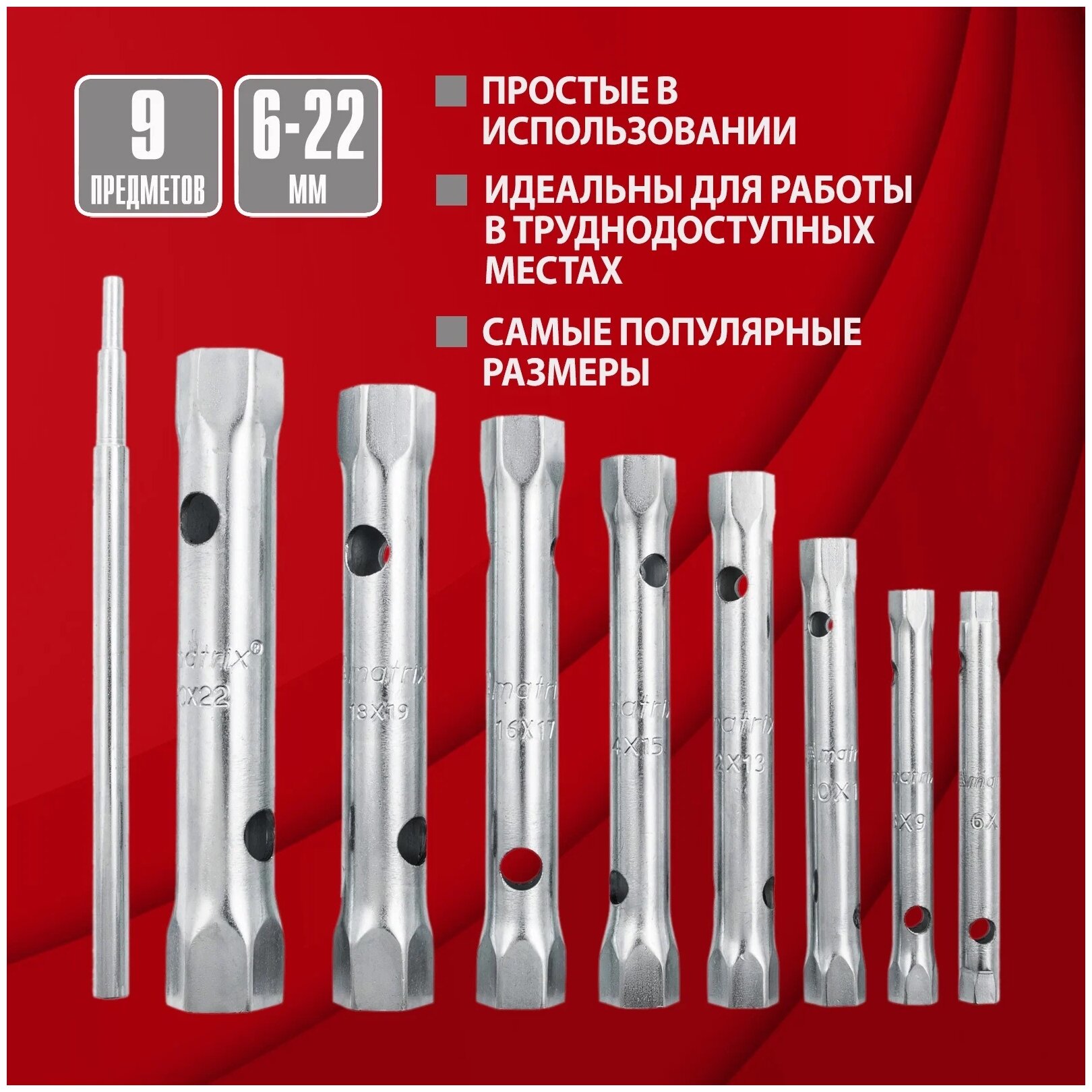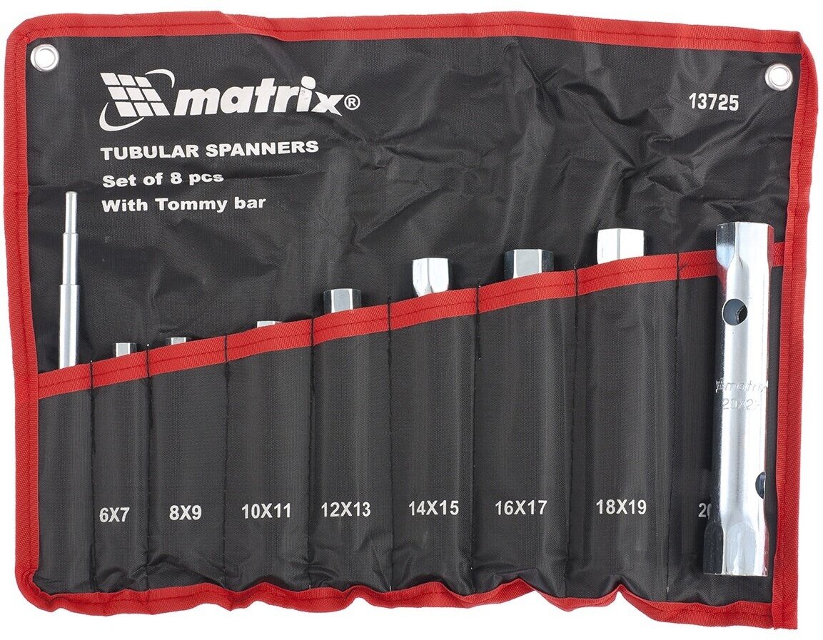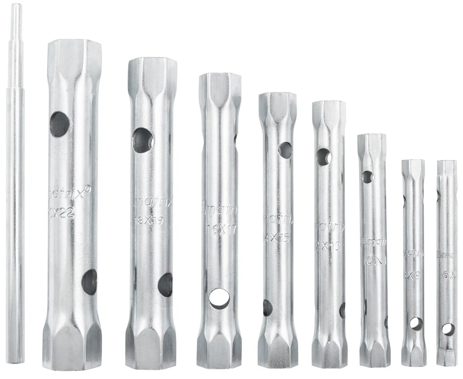 Набор трубчатых ключей MATRIX В набор входят 9 трубчатых ключей. Тонкие стенки ключей-трубок позволяют осуществлять монтаж в труднодоступных местах, когда болтовые соединения размещены в значительных углублениях. Ключи изготовлены из стали 45. Твердость материала рабочей части ключа – 41 HRc, что соответствует требованиям госта. Ключи имеют защитное покрытие из цинка. Набор упакован в сумку для удобного хранения.