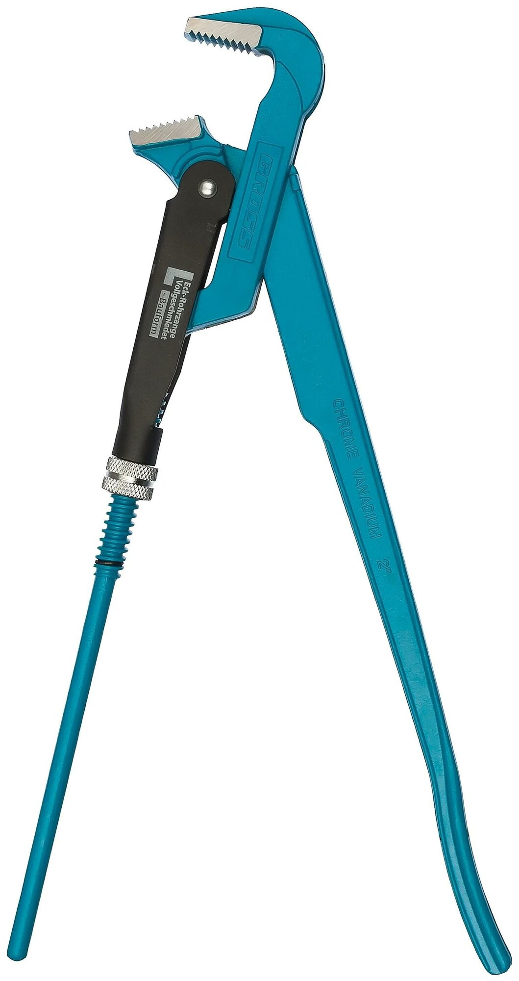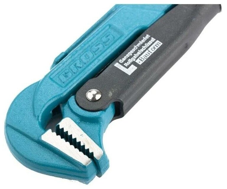 Ключ трубный рычажный Gross типа В усиленной конструкции, применяется при повышенных нагрузках. Предназначен для захватывания и вращения труб и соединительных частей трубопроводов. Изготовлен из высококачественной хромованадиевой стали. Имеет порошковое антикоррозийное покрытие. Губки дополнительно закалены токами высокой частоты до твердости 57–60 HRс. Прогрессивная форма зуба с наклоном против направления вращения обеспечивает самоблокируемый захват деталей. Верхняя ручка имеет выштампованный Т-образный профиль. Регулировочная гайка снабжена стопорным кольцом.