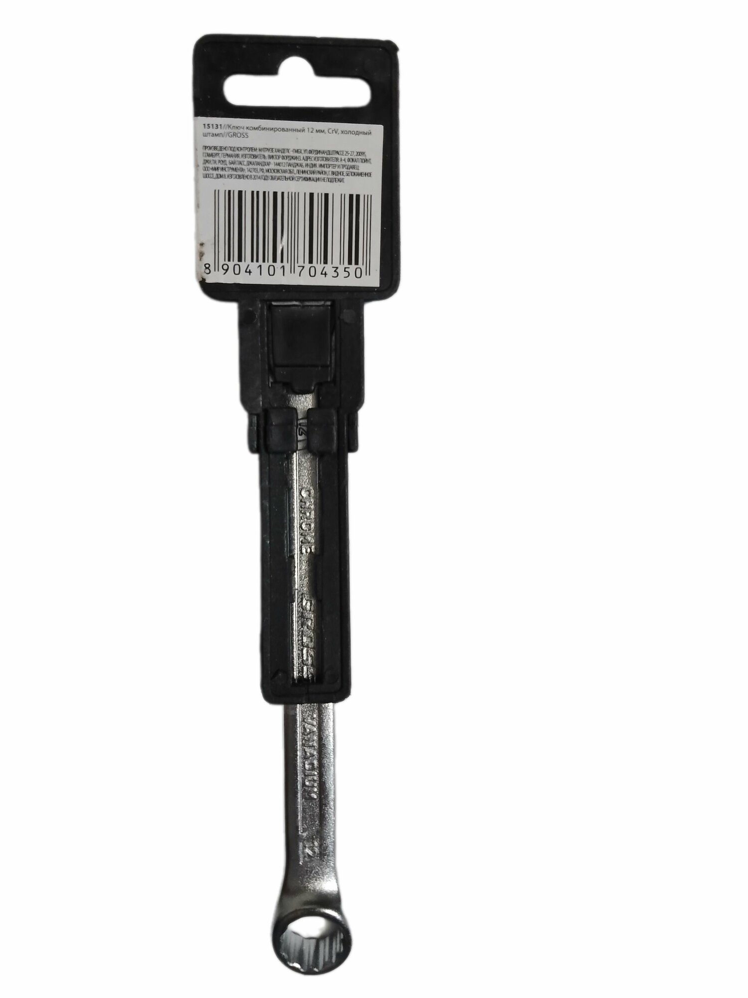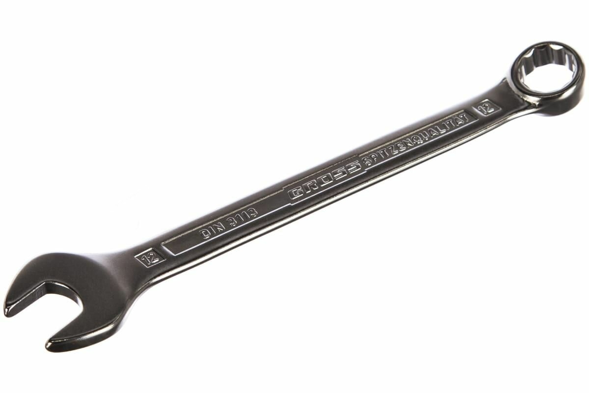 Ключ комбинированный торговой марки GROSS предназначен для монтажа/демонтажа резьбовых соединений. Изготовлен из высококачественной хромованадиевой (Crv) стали методом холодного штампа. Твердость 45-48 HRC. Ключ с одной стороны оснащен захватом открытого типа - рожковым и накидным (кольцевым) с другой стороны. Профиль кольцевого зева имеет 12 граней, что увеличивает площадь соприкосновения рабочих поверхностей и снижает риск деформации граней крепежа при монтаже. Угол наклона кольцевого зева относительно плоскости ключа в 15 градусов делает монтаж более удобным. Хромоникелевое покрытие ключа улучшает антикоррозийные свойства инструмента.