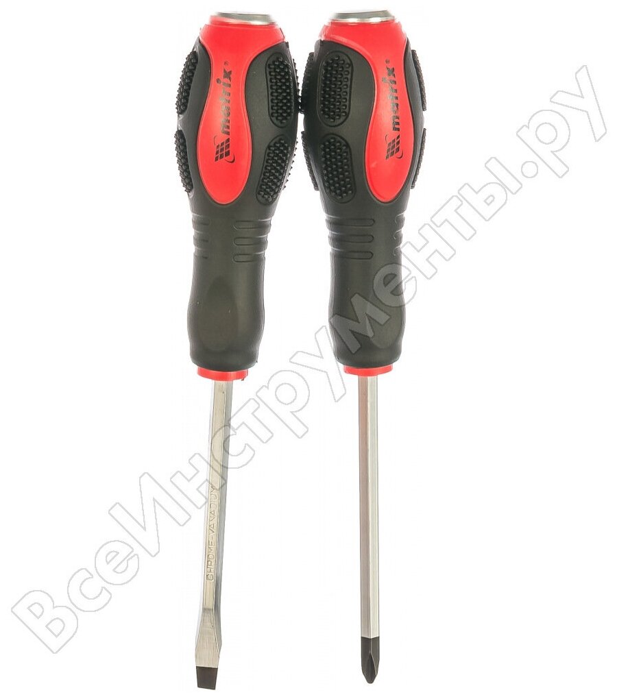 | Прочие особенности и свойства | Отвертки ударные Matrix предназначены для монтажа и демонтажа резьбовых соединений, в том числе застарелых, прикипевших или заржавевших.,Имеют цельный стержень, проходящий сквозь рукоятку, а также стальной затыльник, который позволяет наносить удары молотком или киянкой.,Наконечник стержня намагниченный и фосфатированный.,Материал стержня:высококачественная хромованадиевая сталь. |
