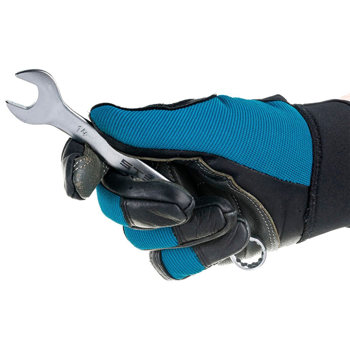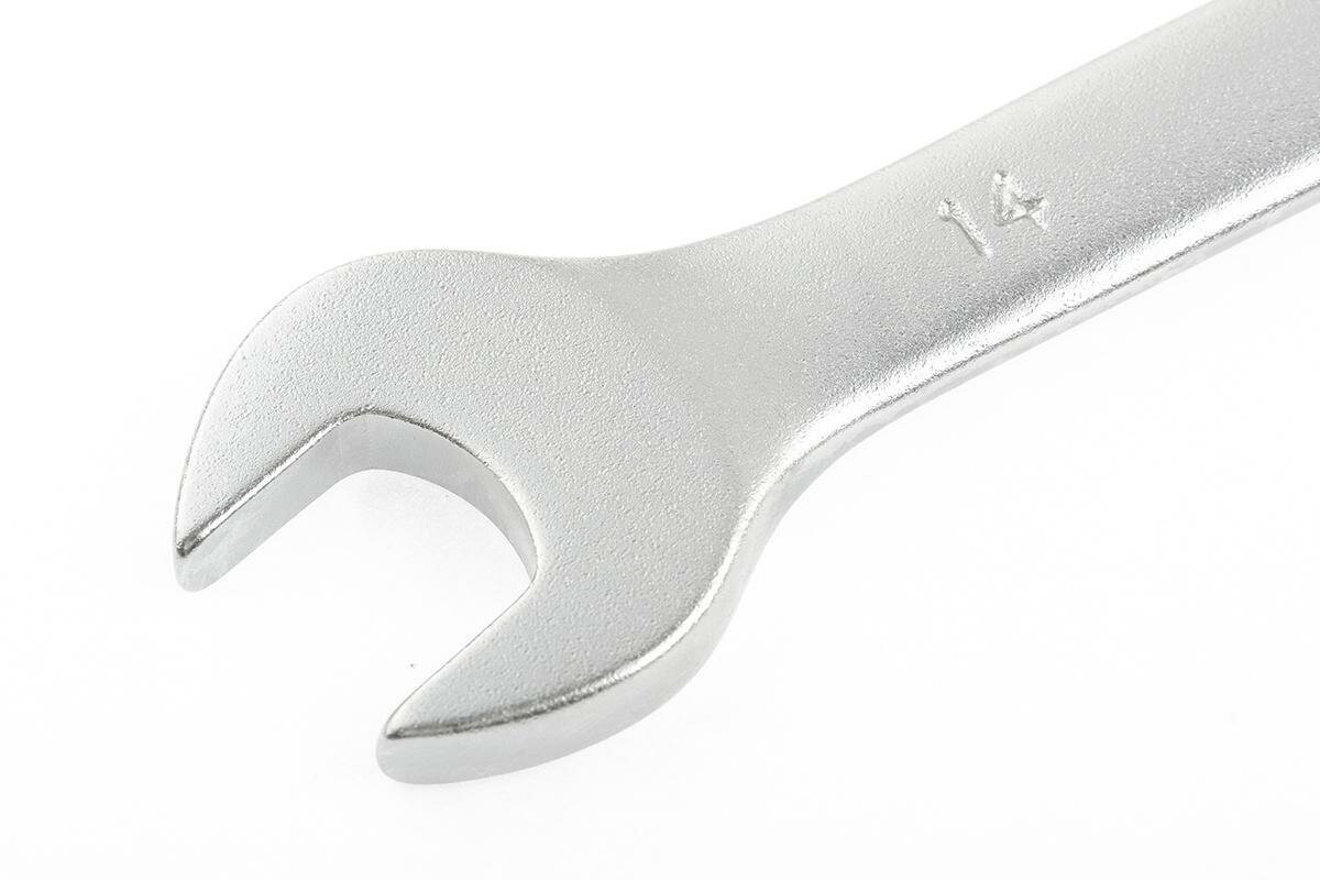 Ключ из хромованадиевой стали с матовым хромоникелевым покрытием. Твердость материала рабочей части — 45 HRc. Профиль кольцевого зева имеет 12 граней, что увеличивает площадь соприкосновения рабочих поверхностей и снижает риск деформации граней крепежа при монтаже. Угол наклона кольцевого зева относительно плоскости ключа в 15 градусов делает монтаж более удобным. Ключ гаечный комбинированный, с открытым и кольцевым зевом предназначен для монтажа/демонтажа резьбовых соединений.