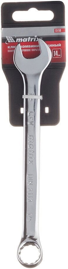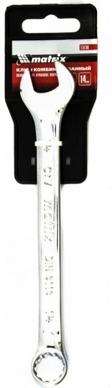 Комбинированный ключ 14 мм MATRIX - прочен и долговечен в работе, он обладает высокой твердостью рабочих частей головок. Инструмент имеет зеркальную полировку хромоникелевого покрытия, которое убережет изделие от появления коррозии. Ключ оснащен двумя видами зевов - кольцевым и открытым. Кольцевой зев обеспечивает более прочный обхват детали за счет двенадцатигранного профиля.