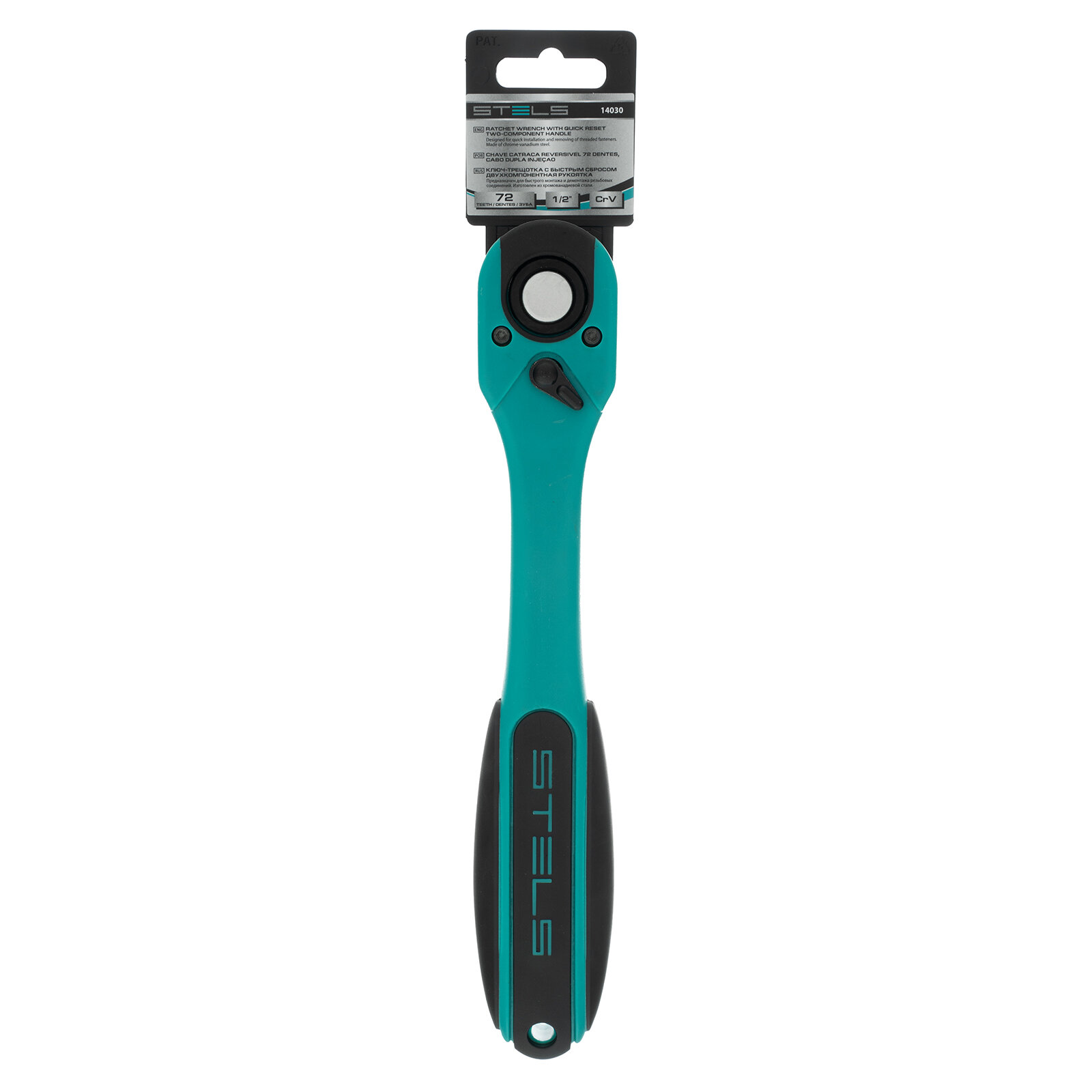 Ключ-трещотка Stels из стали CrV, с присоединительным квадратом 1/2" и 72-зубым храповым механизмом, с быстрым сбросом и 2-компонентной рукояткой, используется для работы с резьбовыми соединениями. Предназначен для установки торцевых головок, а также адаптеров и удлинителей с посадочным отверстием соответствующего размера. Храповой механизм обеспечивает исключительную плавность хода. Инструмент удобен для работы в стесненных условиях, т.к. шаг трещотки составляет всего 5°. Будет полезен в сервисном центре, на СТО, а также пригодится дома или в поездке.