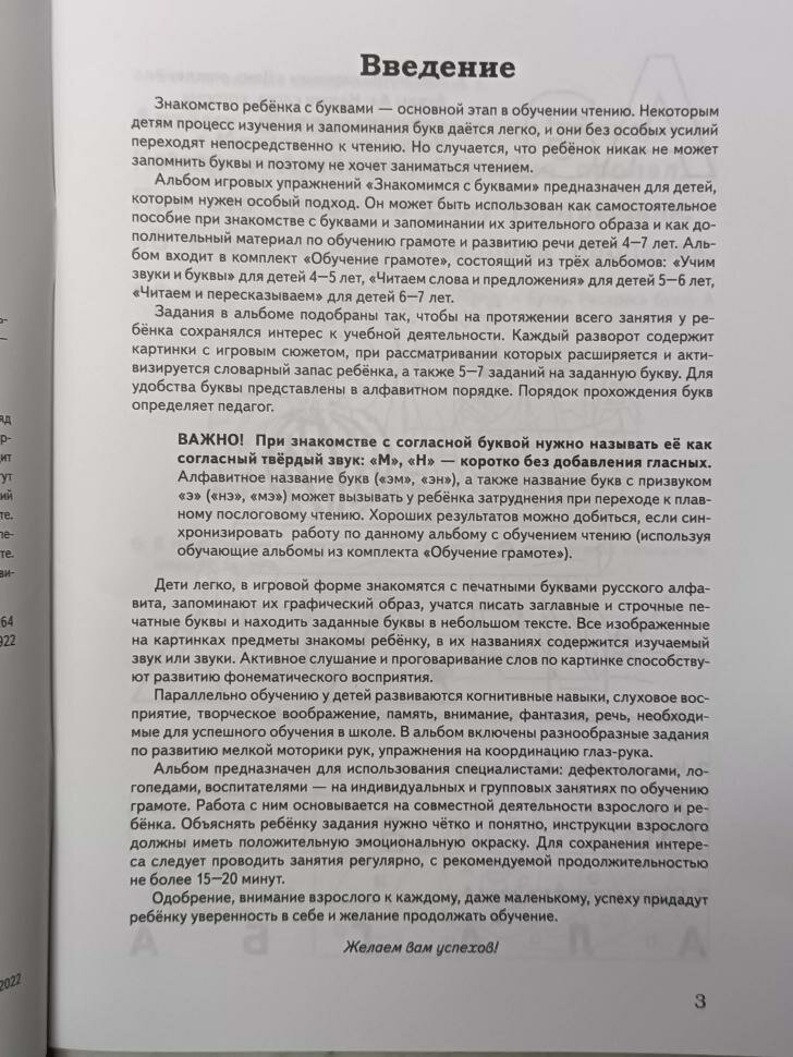 Альбом предназначен для детей, которым тяжело запомнить буквы, и содержит ряд заданий, помогающих решить эту проблему в игровой форме. Является частью авторской системы обучения грамоте и развитию речи детей дошкольного возраста и входит в комплект альбомов «Обучение грамоте». Занимаясь по данному пособию, дети смогут познакомиться с печатными буквами русского алфавита и запомнить их графический образ, а также научиться писать буквы и находить заданные буквы в небольшом тексте.