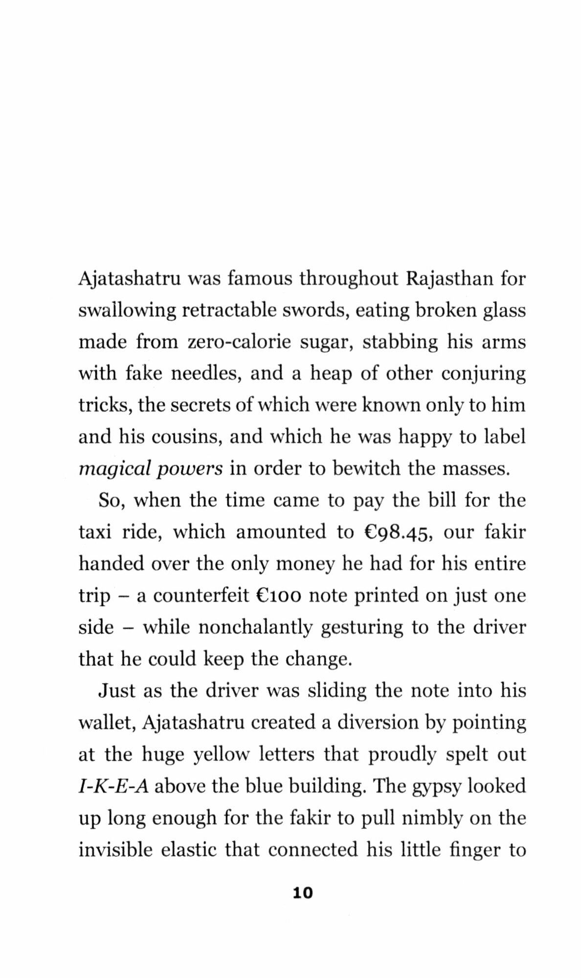 So begins a magnificent adventure for the intrepid fakir as he travels to Italy in a suitcase, writes a novel on a shirt, flees a revenge-crazed taxi driver, flies to Libya in a hot air balloon and finds love in the unlikeliest of places…