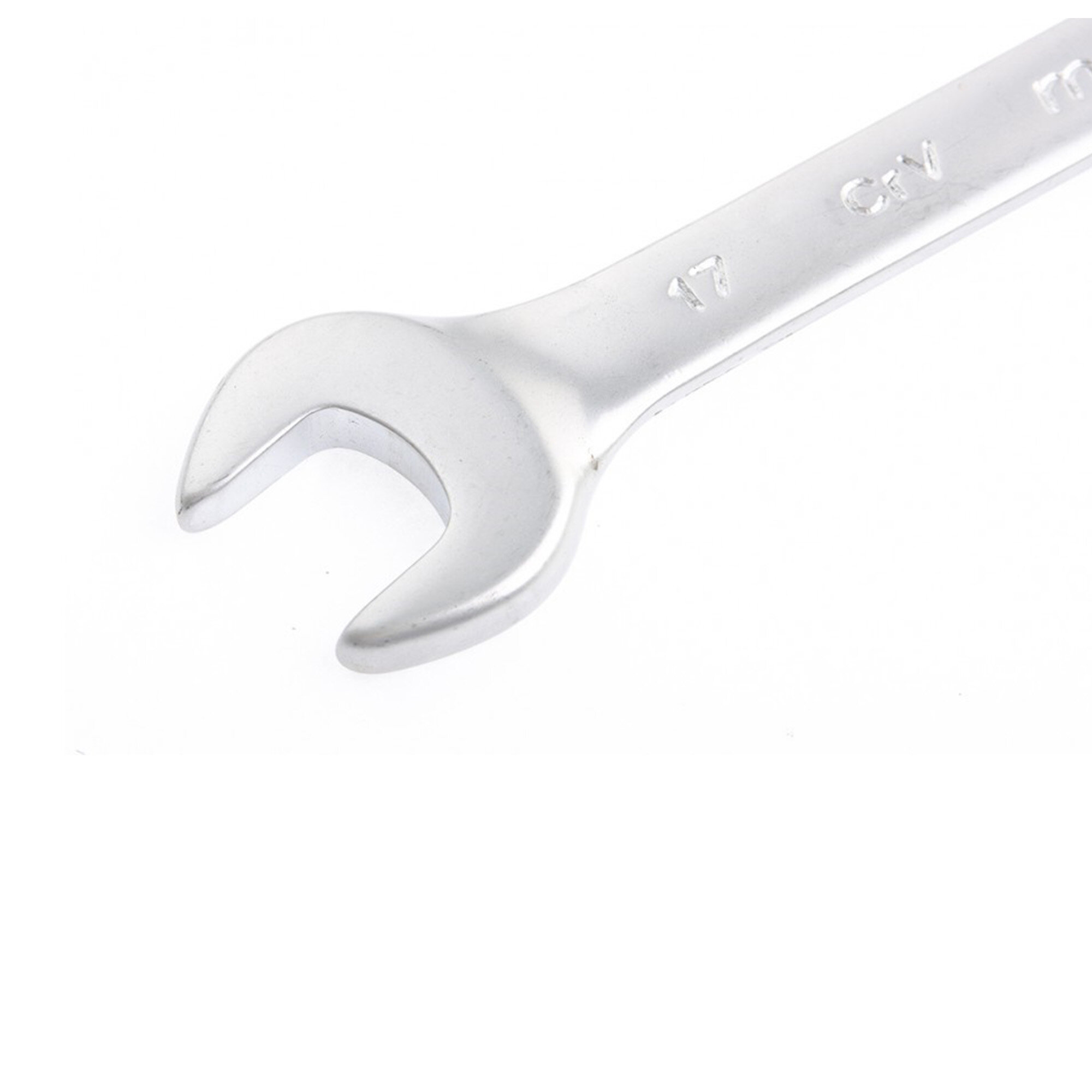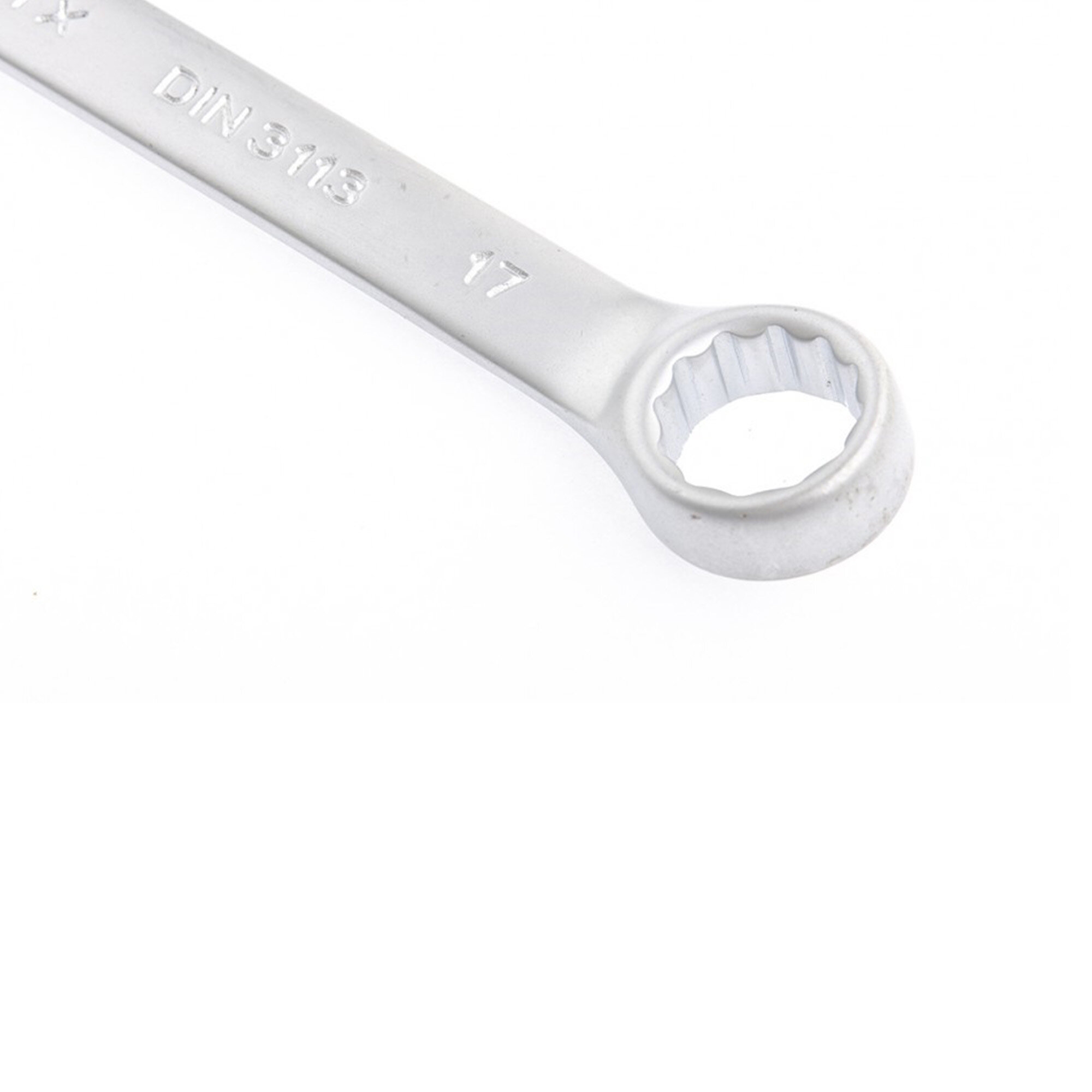 | Прочие особенности и свойства | Ключ изготовлен из хромванадиевой стали. Твердость материала рабочей части ключа 45 HRc (требования ГОСТ – 45–51 HRc). Ключ имеет антикоррозионное покрытие из хрома. Профиль кольцевого зева имеет 12 граней, что увеличивает площадь соприкосновения рабочих поверхностей и снижает риск деформации граней крепежа при монтаже. Угол наклона кольцевого зева относительно плоскости ключа в 15 градусов делает монтаж более удобным. Ключ гаечный комбинированный с открытым и кольцевым зевом предназначен для монтажа демонтажа резьбовых соединений. |