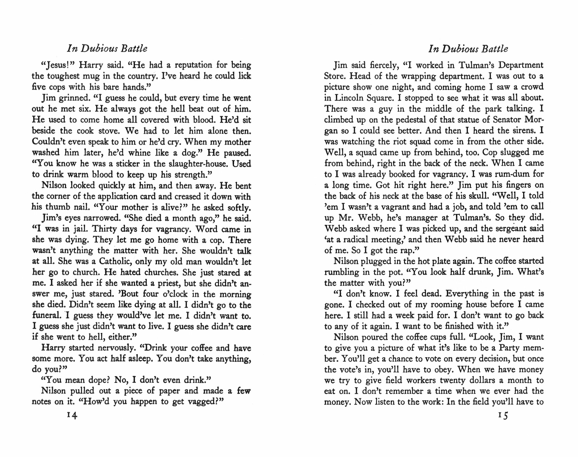 Both a fast-paced story of social unrest and strike, and the tale of one young man's struggle for identity, IN DUBIOUS BATTLE is a novel about the apocalyptic violence that breaks out when the masses become the mob. Set in California apple country, a strike by migrant workers spirals out of control, as principled defiance turns into blind fanaticism. Caught in this upheaval is Jim Nolan, a once aimless man who finds himself briefly becoming the leader of the strike before being crushed in its service. IN DUBIOUS BATTLE explores and dramatises many of the ideas and themes key to Steinbeck's writing.