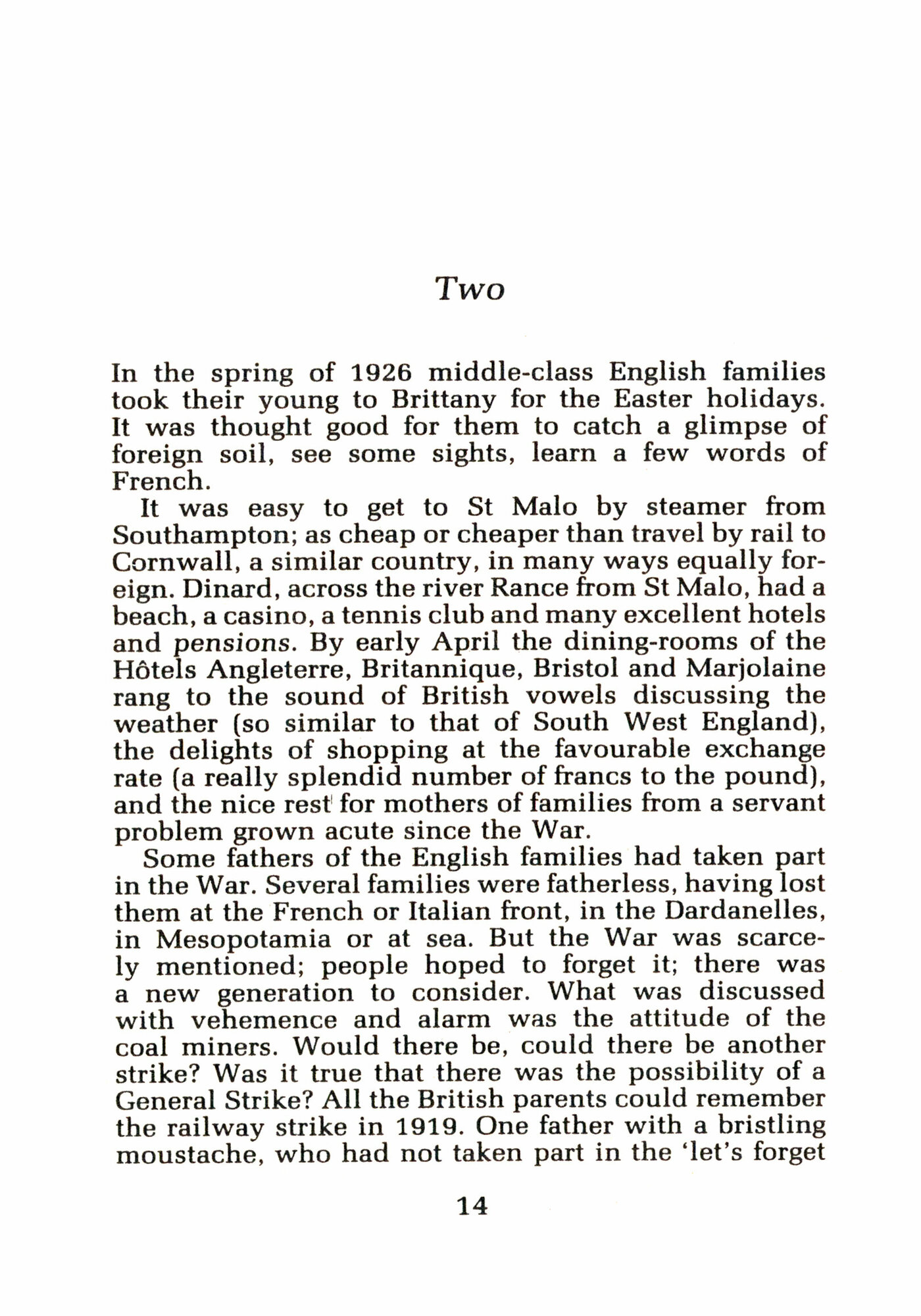 Flora Trevelyan is a ten-year-old misfit, despised by her selfish and indolent parents, and left to wander the streets of a small French town whilst her parents prepare to depart for life in colonial India. There she befriends the locals, acquires an extensive vocabulary of French foul language and encounters the privileged lifestyle of the elegant, middle-class British families holidaying in 1920s France.