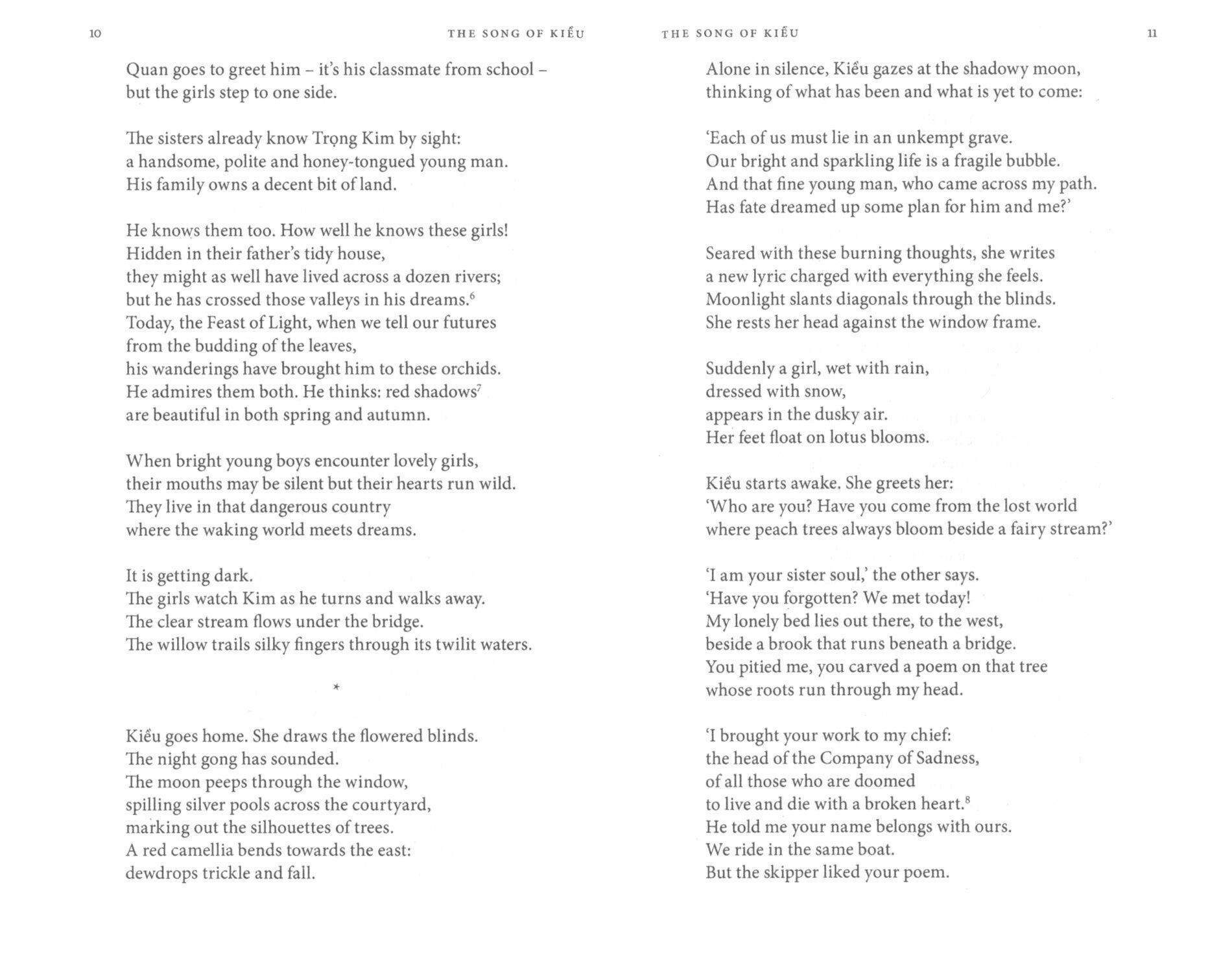 Ever since it exploded into Vietnam's cultural life two centuries ago, The Song of Kieu has been one of that nation's most beloved and defining central myths. It recounts the tragic fate of the beautiful singer and poet Kieu, who agrees to marry to save her family from debt but is tricked into working in a brothel. Over the course of a swift-moving story involving kidnap, war, jealous wives and rebel heroes, she will become a queen, wife, nun, slave, victim and avenger, surviving through the strength of her words and her wits alone.