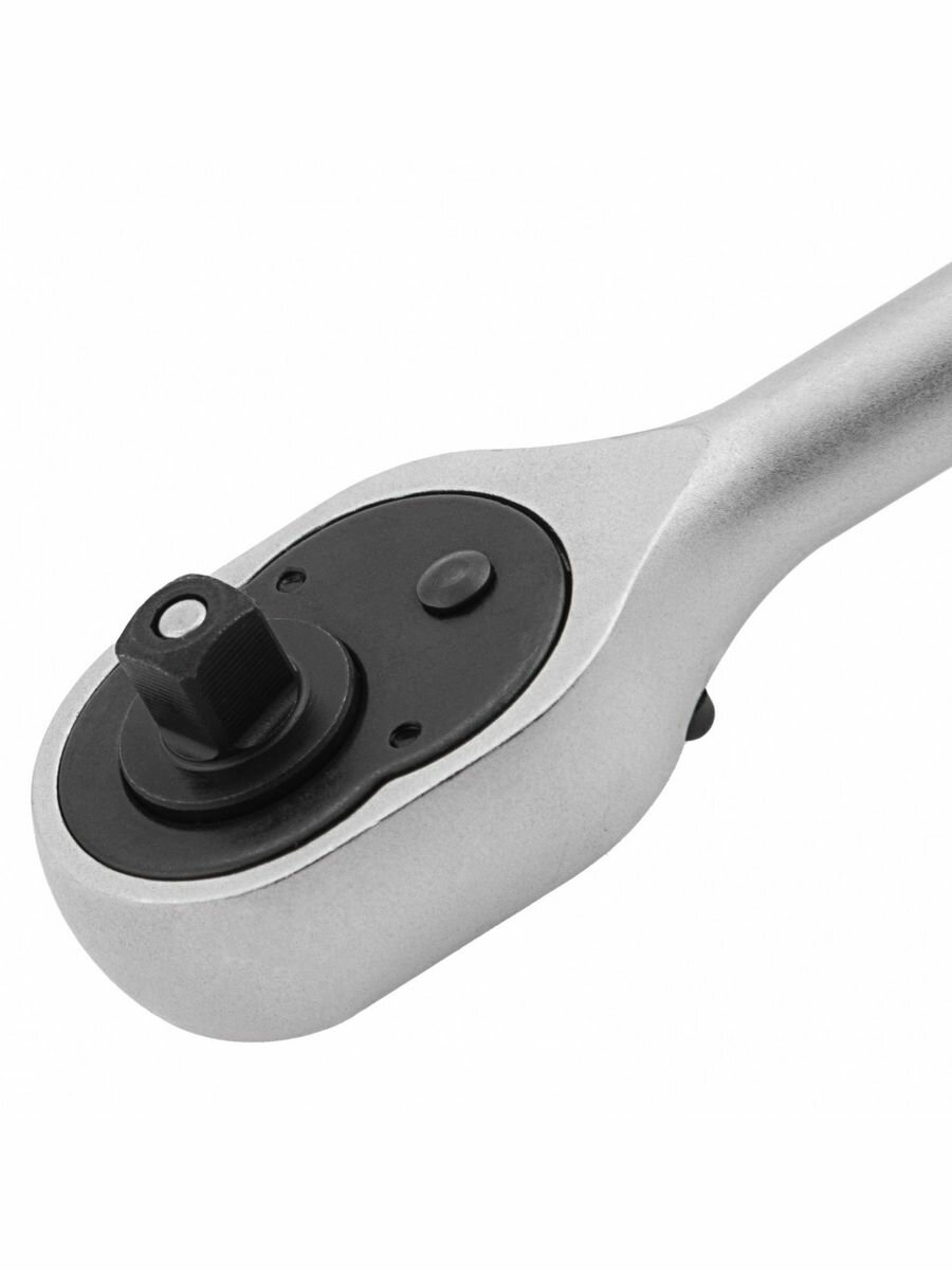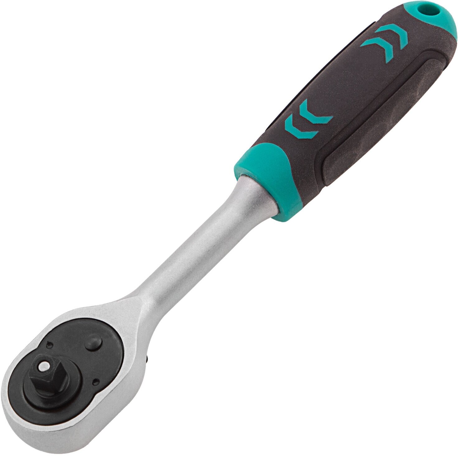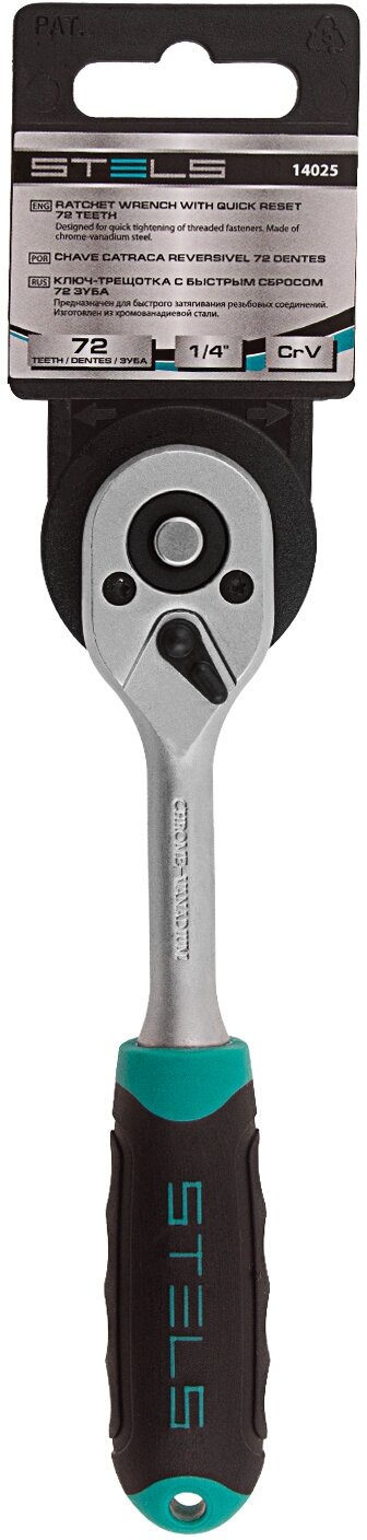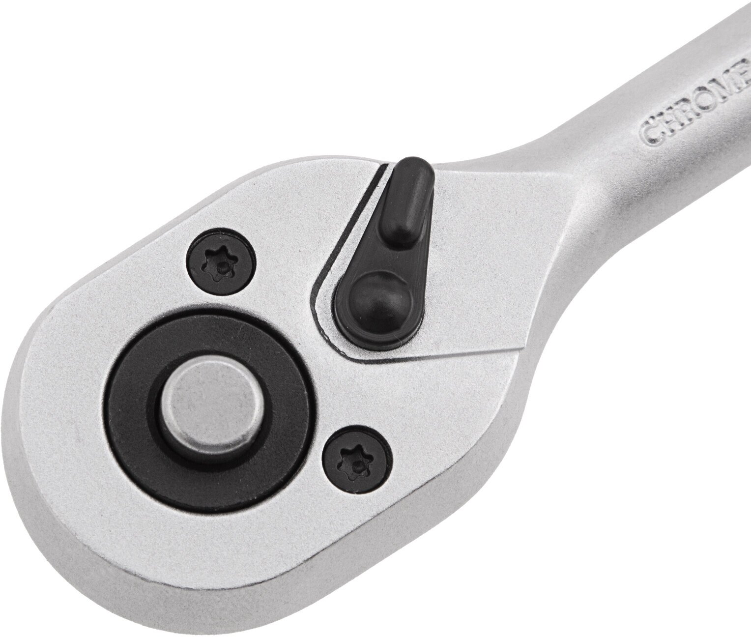 Ключ изготовлен из хромванадиевой стали. Имеет антикоррозионное покрытие из хрома. Храповый механизм с переключателем обеспечивает плавный ход и возможность быстрой смены направления вращения ключа. Присоединительный квадрат с шариковым фиксатором надежно удерживает съемные торцевые головки различных размеров, удлинители, адаптеры. Ключ снабжен механизмом быстрого сброса насадок. Ключ имеет эргономичную двухкомпонентную ручку. Предназначен для быстрого монтажа резьбовых соединений.72 зуба с быстрым сбросом crv