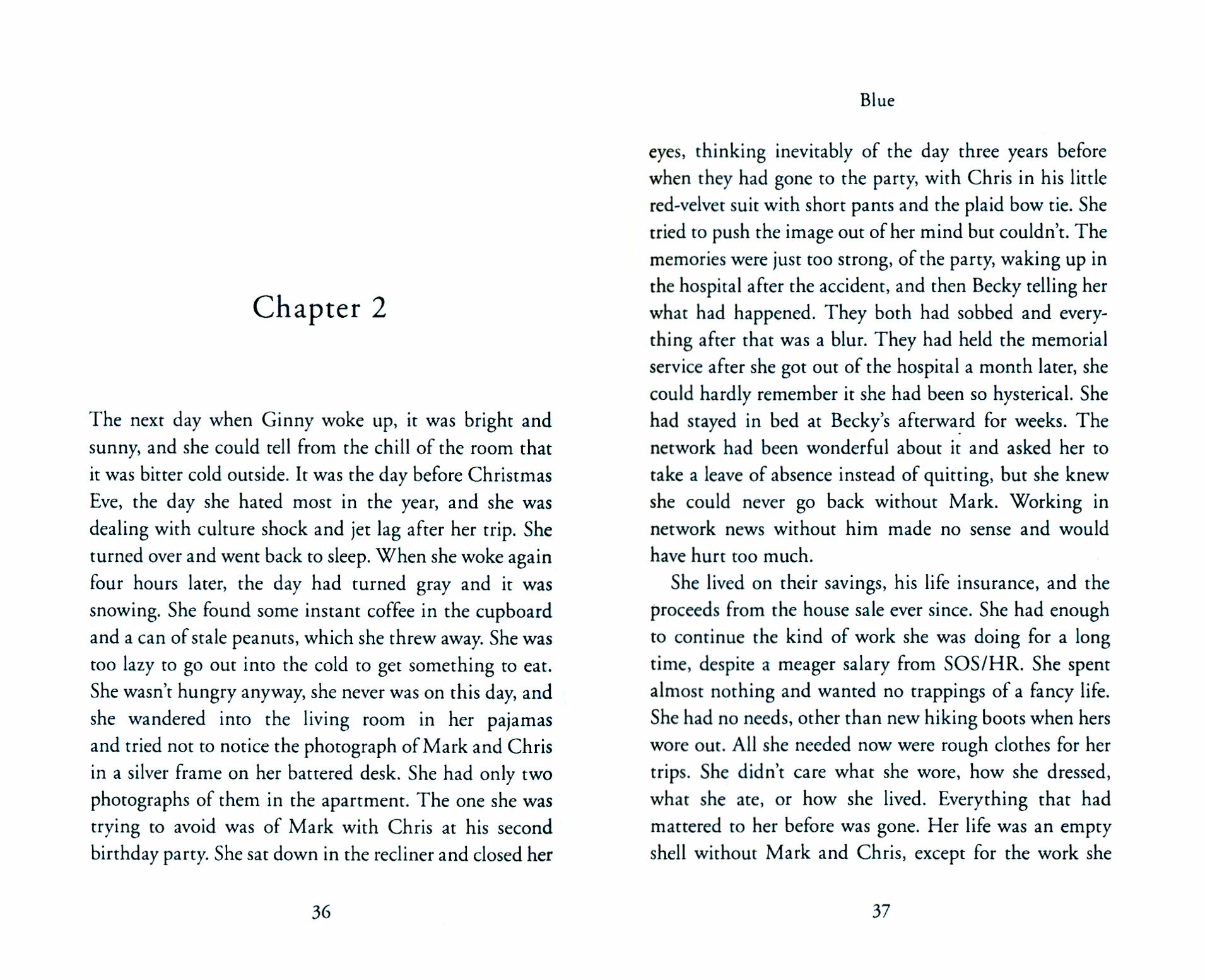 Then, on the anniversary of the fateful accident, she meets thirteen-year-old Blue Williams, who has been living on the streets, utterly alone. Ginny reaches out to him and slowly their friendship grows, each becoming the family the other lost.