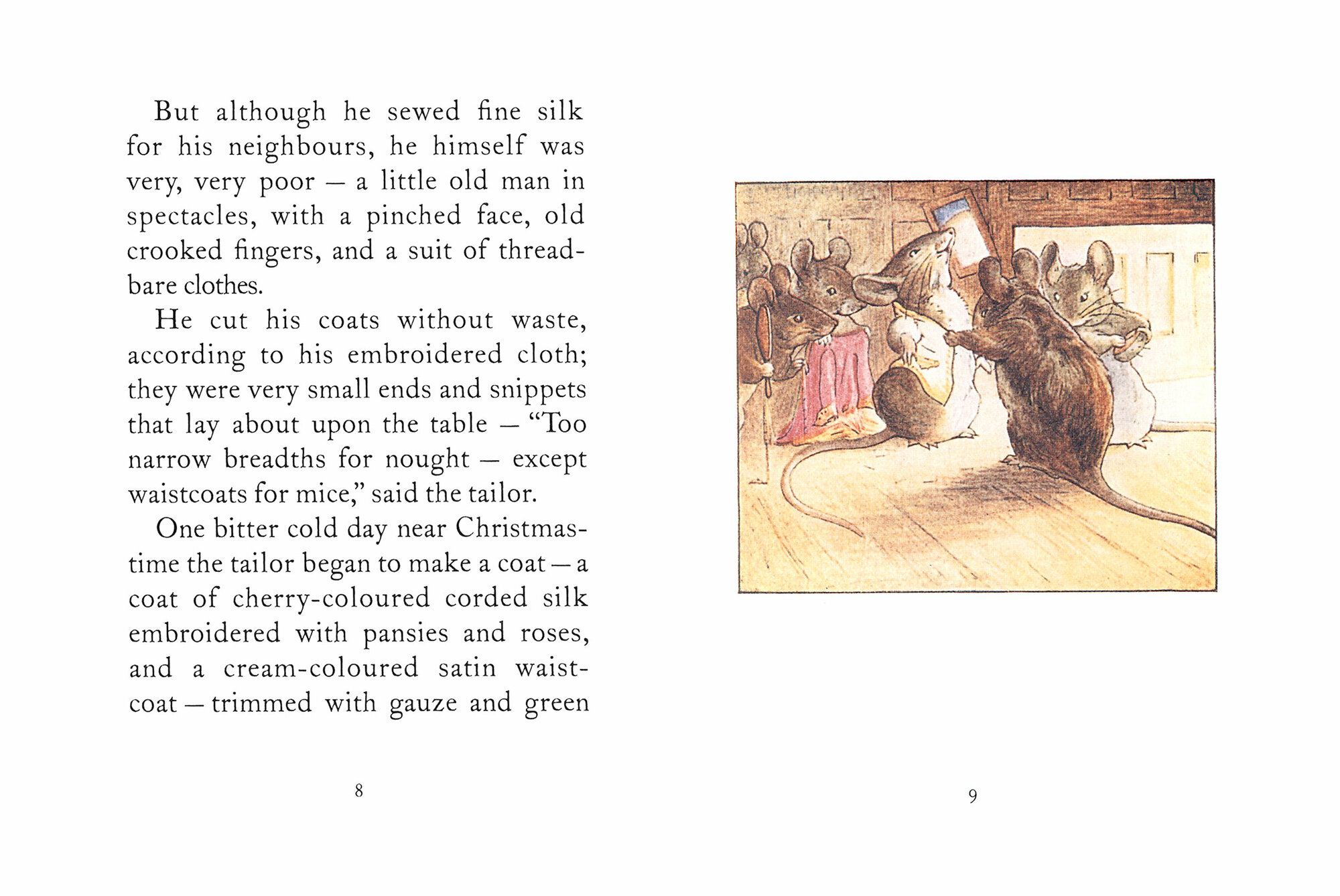 The Tailor of Gloucester was first published in 1903 and tells the story of a poor tailor trying to survive in his freezing workshop over a hard winter. He has a terribly important commission to complete for the Mayor of Gloucester's wedding on Christmas Day but is ill and tired, and before long is running out of food and thread, as well as time! How will he possibly complete the beautiful coat and embroidered waistcoat? Luckily, there lives in the dresser, some very kind and very resourceful mice who set about helping the poor tailor with his work. Not only are they exceedingly helpful, but they are also, luckily, far far too clever for the tailor's sly cat, Simpkin.