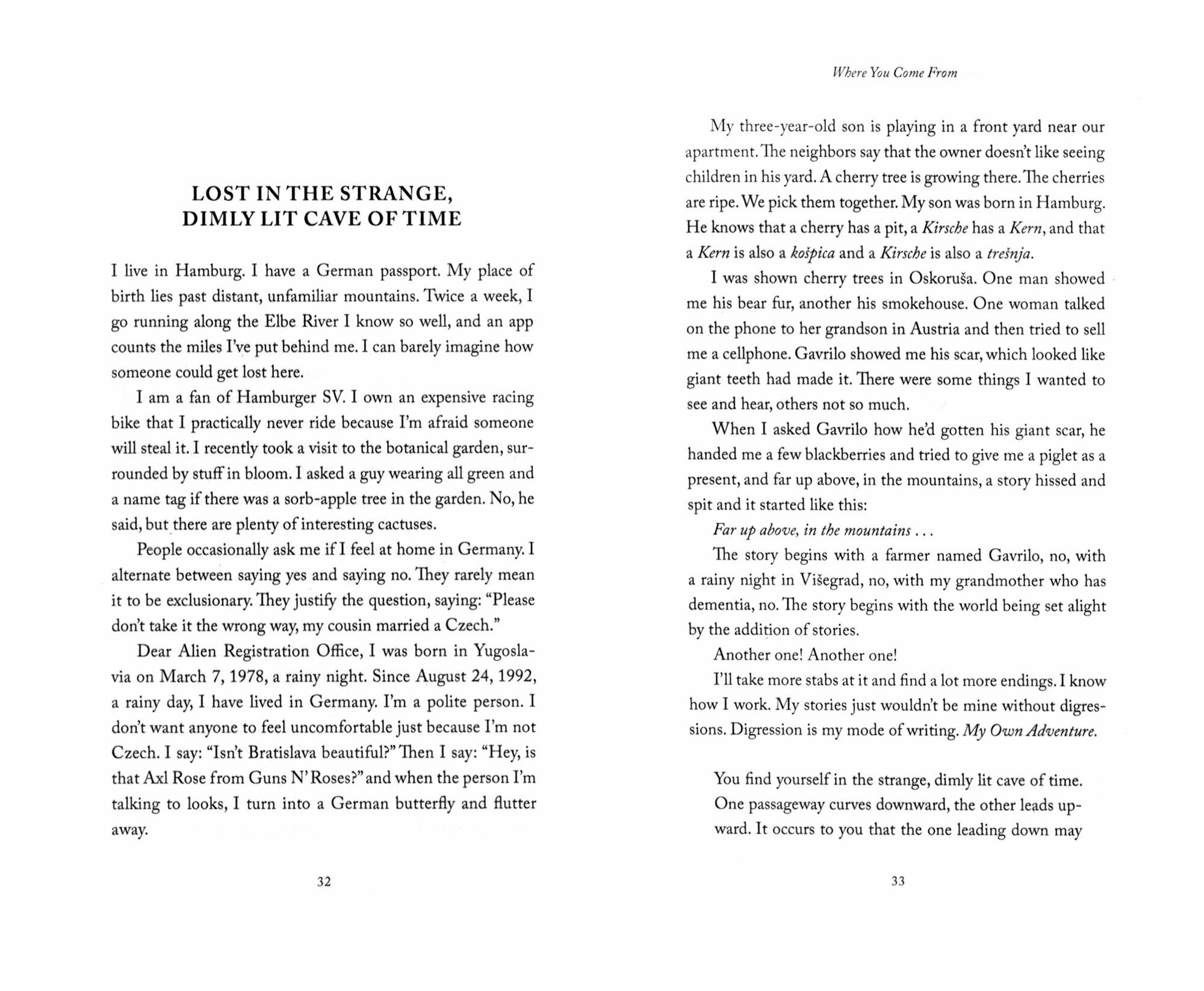 Translated by Damion Searls, Where You Come From is about homelands, both remembered and imagined. A book that bends form and genre with wit, heart, and exceptional craftsmanship to explore questions that lie inside all of us: about language and shame, about arrival and making it just in time, about luck and death, about what role our origins and memories play in our lives.