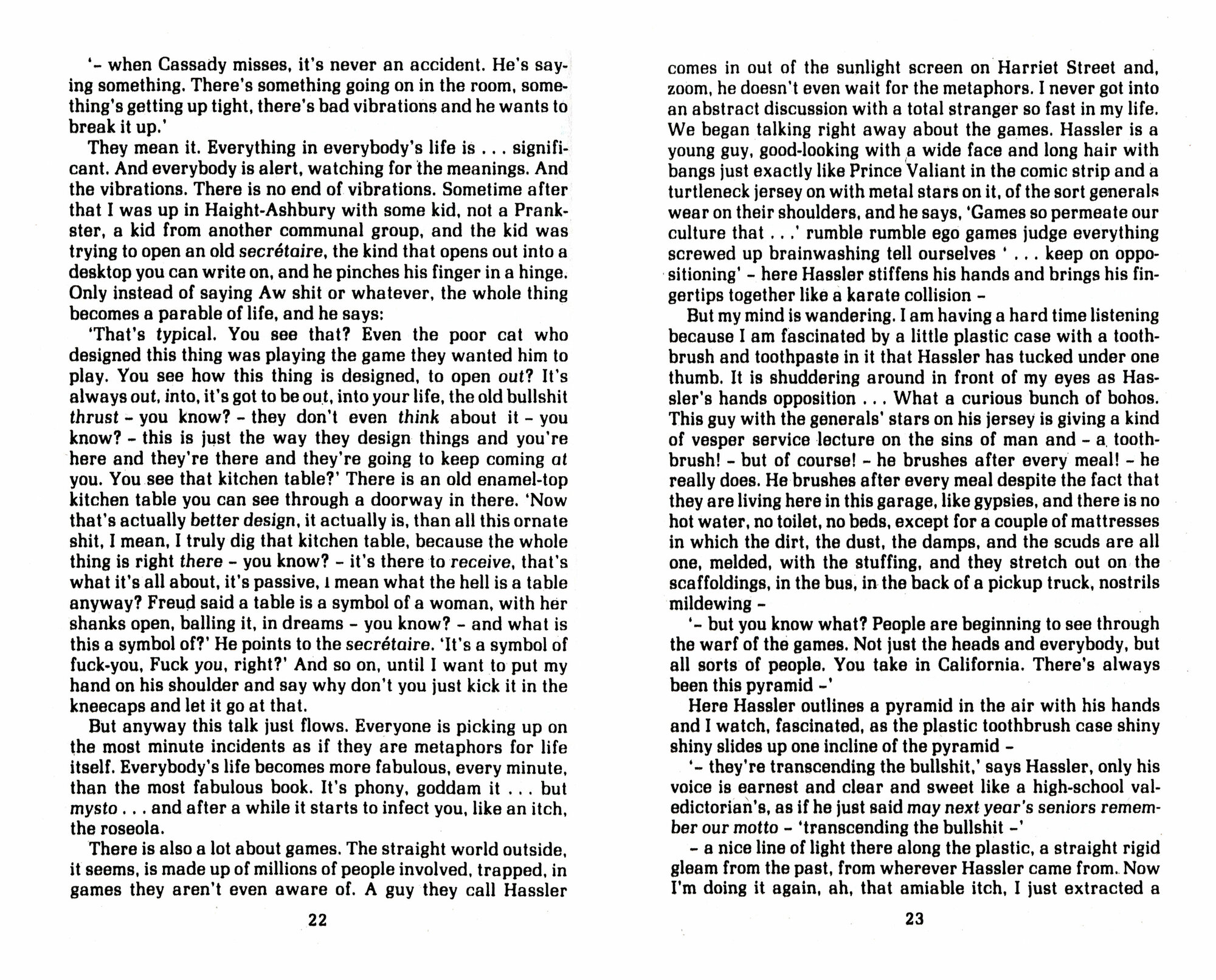 I looked around and people's faces were distorted...lights were flashing everywhere...the screen at the end of the room had three or four different films on it at once, and the strobe light was flashing faster than it had been...the band was playing but I couldn't hear the music...people were dancing...someone came up to me and I shut my eyes and with a machine he projected images on the back of my eye-lids...I sought out a person I trusted and he laughed and told me that the Kool-Aid had been spiked and that I was beginning my first LSD experience...