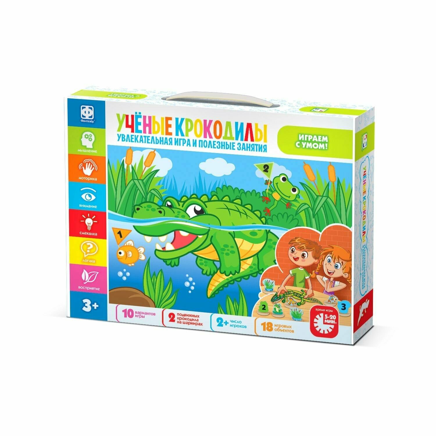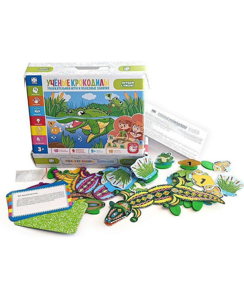| Комплектация | 2 крокодила из подвижных деталей; 6 рыбок, 6 лягушек, 6 кустов; 6 шарниров для крепления частей крокодилов, 4 бегающих глаза; 18 подставок из полимерного материала; 10 карточек с игровыми заданиями |
