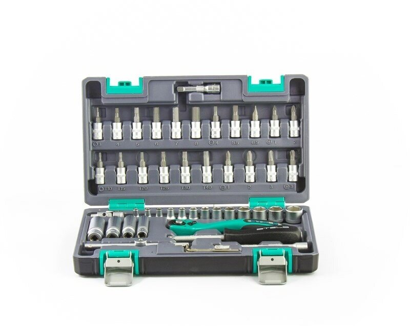 | Подробный состав комплекта | Ключ трещоточный1/4" Головки торцевые1/4" 4, 4.5, 5, 5.5, 6, 7, 8, 9, 10, 11, 12, 13, 14, Т10, Т15, Т20, Т25, Т30, T40, SL4, SL5.5, SL6.5, PH1, PH2, PH3, PZ1, PZ2, PZ3, H3, H4, H5, H6, H7, H8. Головки торцевые удлиненные1/4" 8, 10, 11, 13 Кардан 1/4" Удлинитель1/4" Отвертка-держатель1/4" Вороток Т-образный1.5мм, 2.0мм, 2.5мм Комплект шестигранных ключей1.5мм, 2.0мм, 2.5мм |
