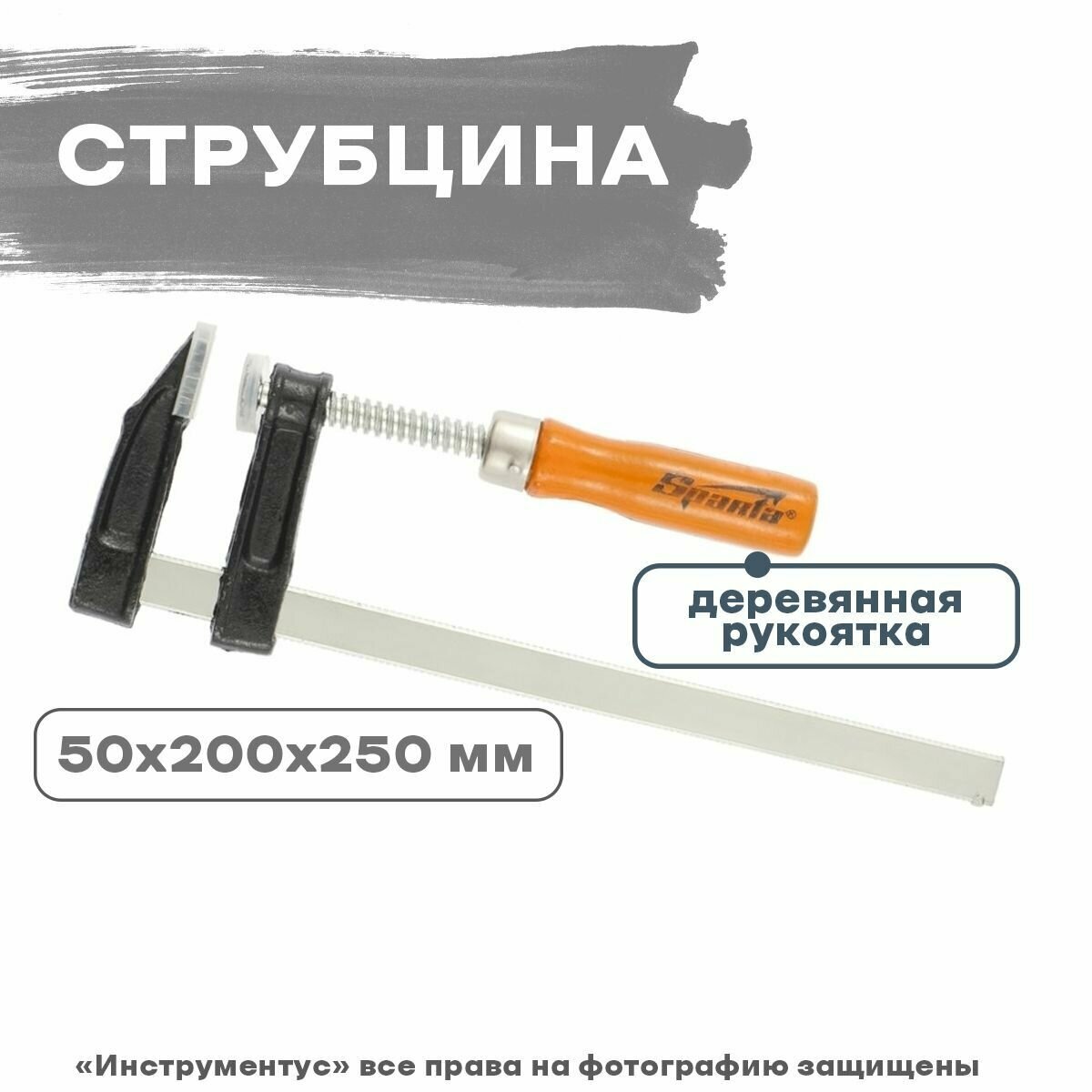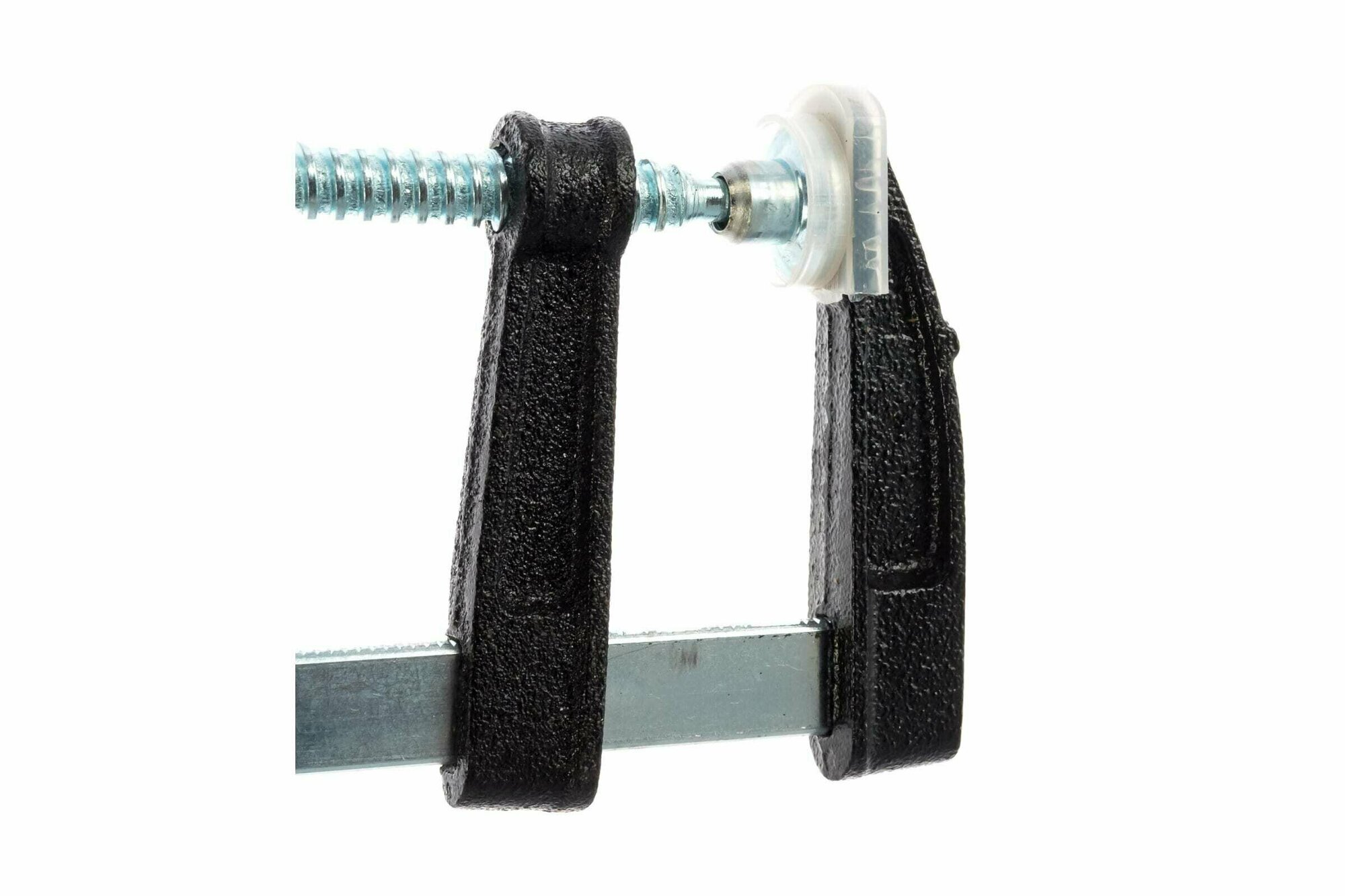 F-образная струбцина Sparta , 200 х 50 х 250 мм, используется в столярном и слесарном деле и позволяет фиксировать заготовки из металла, древесины и других материалов для их соединения или обработки. Деталь помещают между губками, одна из которых подвижна и служит для регулировки величины захвата. Винтовой зажим позволяет прикладывать значительное усилие для надежной фиксации. Защитные накладки предотвращают повреждение детали. Элементы конструкции выдерживают высокую температуру, поэтому струбцина подходит для проведения сварочных работ, при этом пластиковые накладки необходимо снять.Преимущества:Штанга изготовлена из стали, поэтому обладает повышенной устойчивостью к изгибанию и выдерживает значительные нагрузки.Оцинкованный винт устойчив к коррозии, что увеличивает срок службы инструмента.Удобная деревянная рукоятка надежно лежит в руке, что повышает комфортность работы.