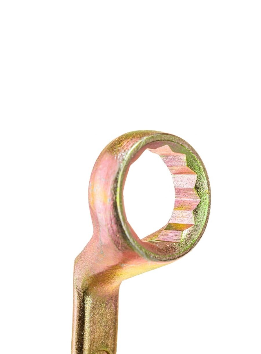 | Прочие особенности и свойства | Ключ гаечный коленчатый имеет два кольцевых зева разных размеров., Профиль кольцевого зева имеет 12 граней, что увеличивает площадь соприкосновения рабочих поверхностей и снижает риск деформации граней крепежа при монтаже., Накидные рабочие части ключа смещены относительно его рукоятки, что позволяет работать в труднодоступных местах., Изготовлен из углеродистой стали. |
