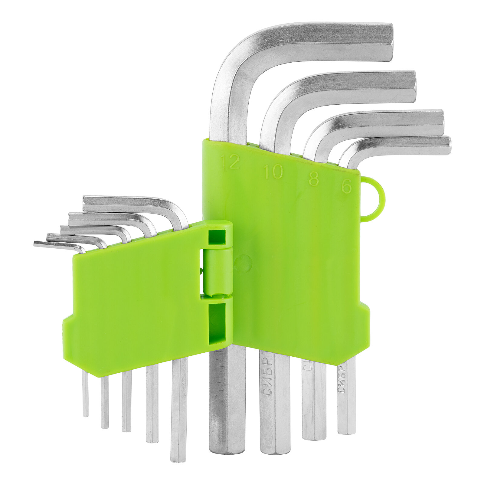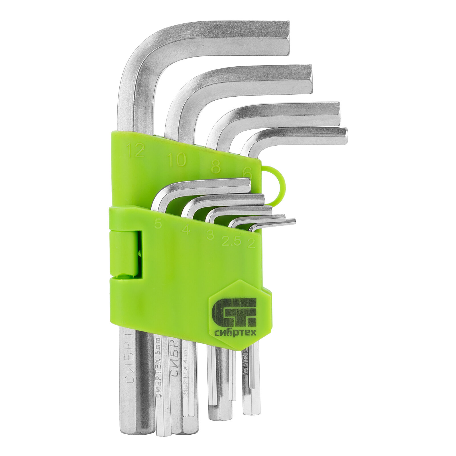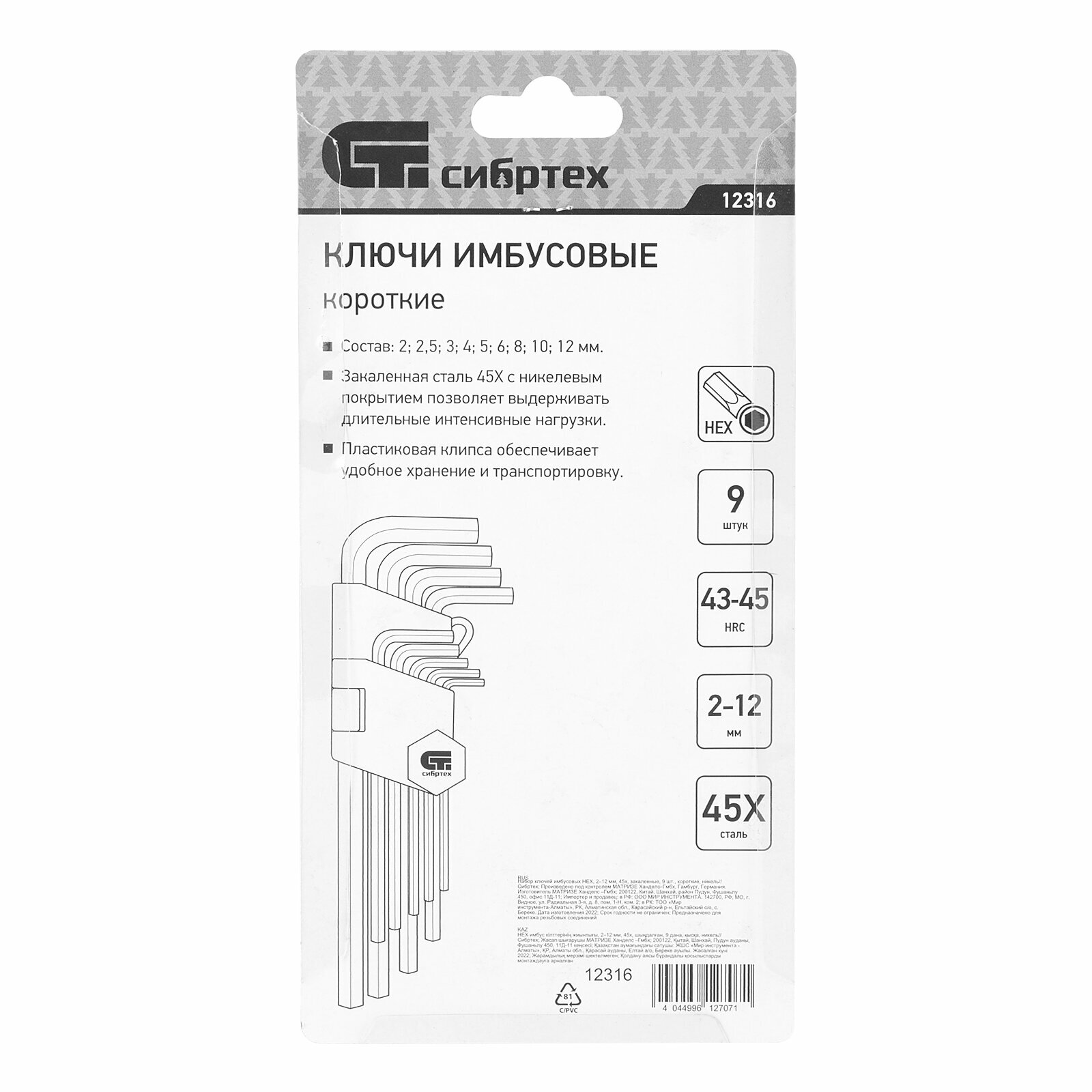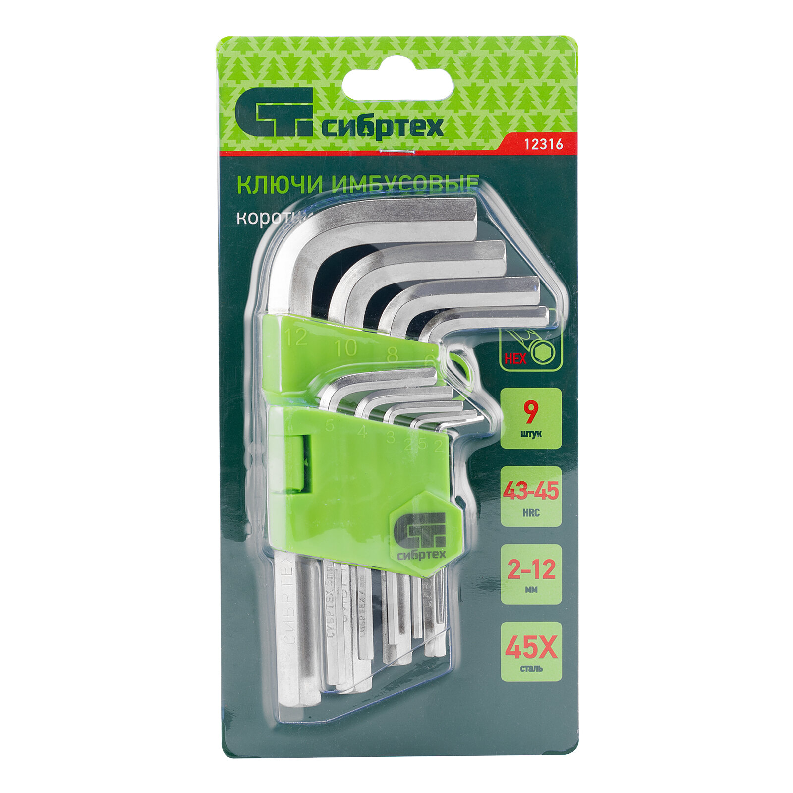 Набор коротких имбусовых ключей HEX, 2-12мм, 45Х, 9 шт, никель СИБРТЕХ состоит из прочных, надежных, долговечных, износо- и коррозиестойких ручных интурментов для работы с винтами, имеющими шестигранный шлиц. Для удобства хранения комплекта в едином состоянии предусмотрен пластиковый держатель.