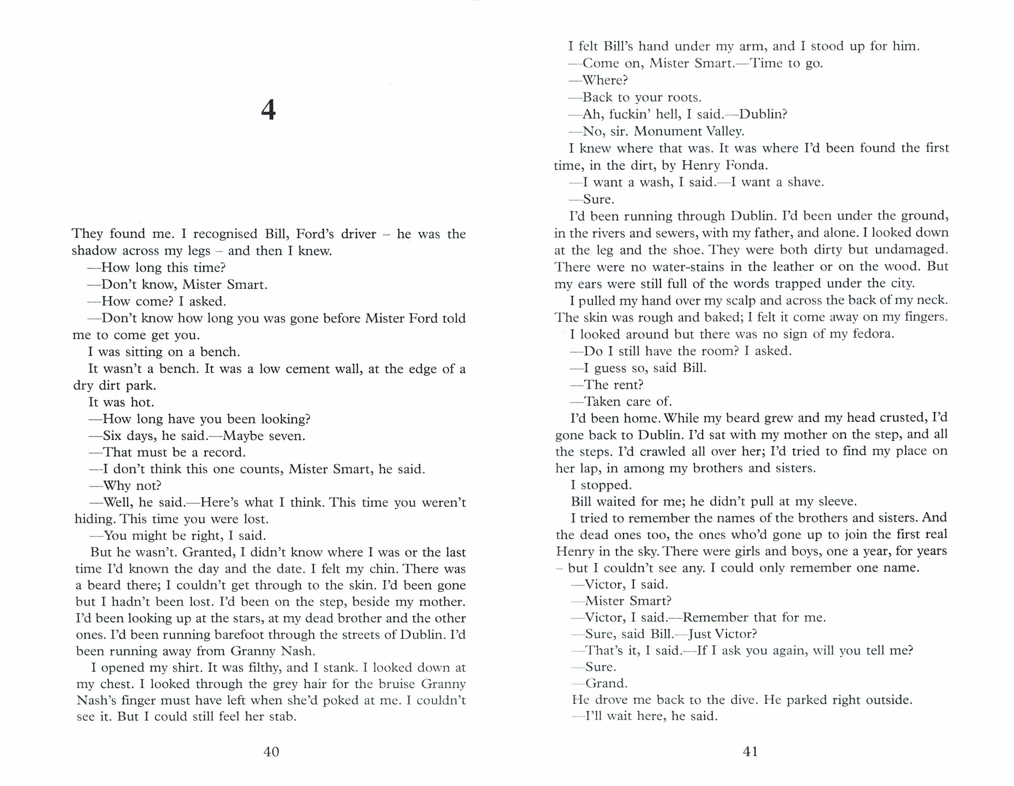 We last saw Henry Smart, his leg severed in an accident with a railway boxcar, crawl into the Utah desert to die - only to be discovered by John Ford, who's there shooting his latest Western.
