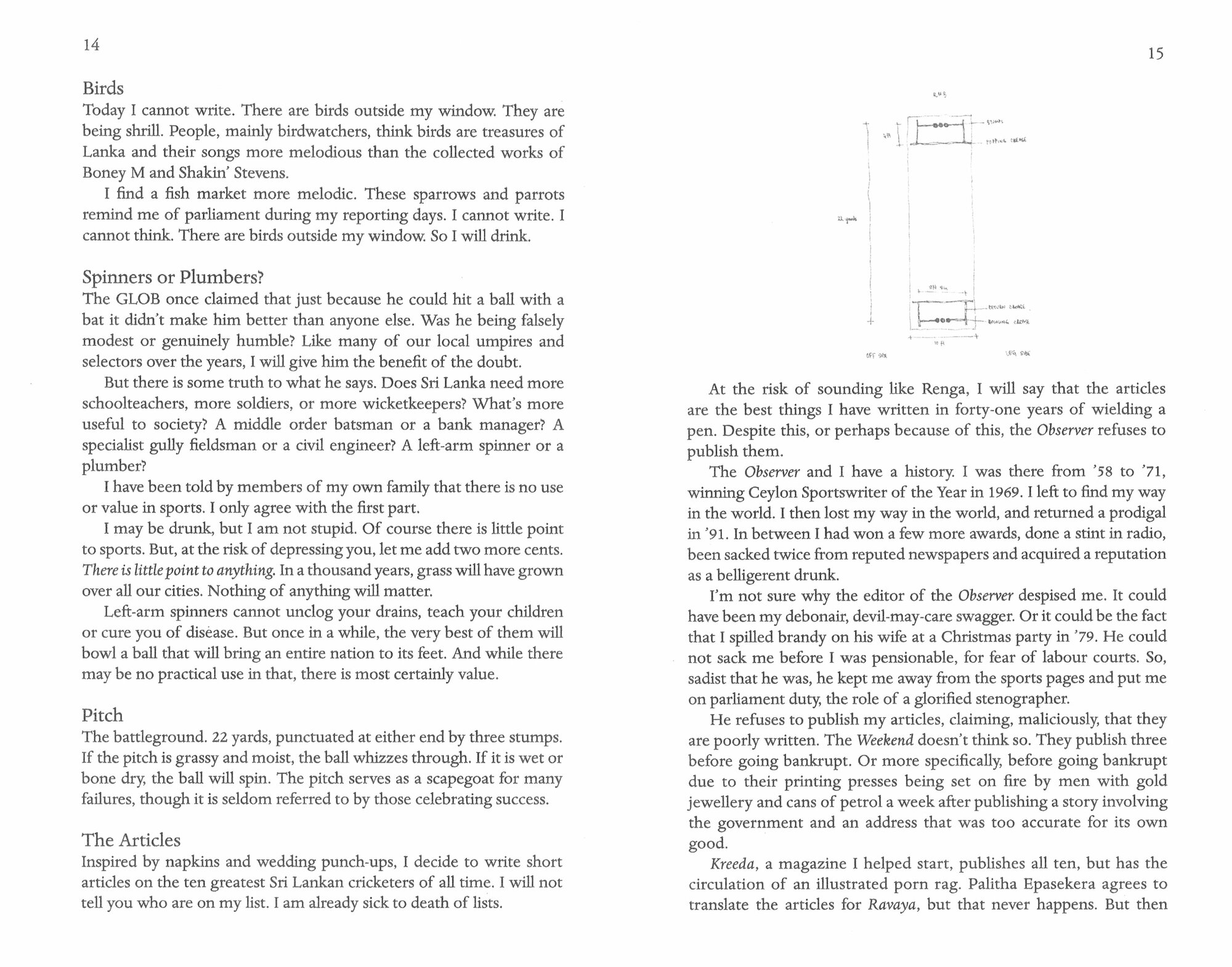 W.G. will spend his final months drinking arrack, making his wife unhappy, ignoring his son and tracking down the mysterious Pradeep. On his quest he will also uncover a coach with six fingers, a secret bunker below a famous stadium, a Tamil Tiger warlord, and startling truths about Sri Lanka, cricket and himself.