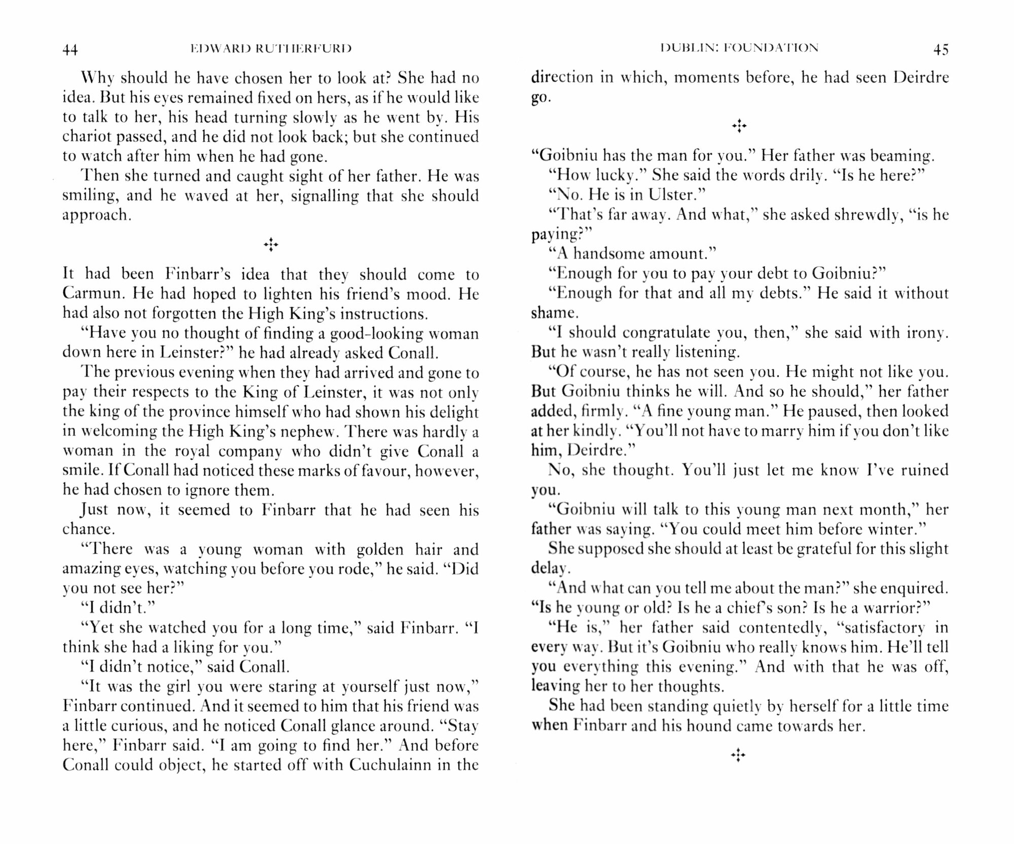 Edward Rutherfurd's great Irish epic reveals the story of the people of Ireland through the focal point of the island's capital city. The epic begins in pre-Christian Ireland during the reign of the fierce and powerful High Kings at Tara, with the tale of two lovers, the princely Conall and the ravishing Deirdre, whose travails echo the ancient Celtic legend of Cuchulainn. From this stirring beginning, Rutherfurd takes the reader on a graphically realised journey through the centuries. Through the interlocking stories of a powerfully-imagined cast of characters - druids and chieftains, monks and smugglers, merchants and mercenaries, noblewomen, rebels and cowards - we see Ireland through the lens of its greatest city.