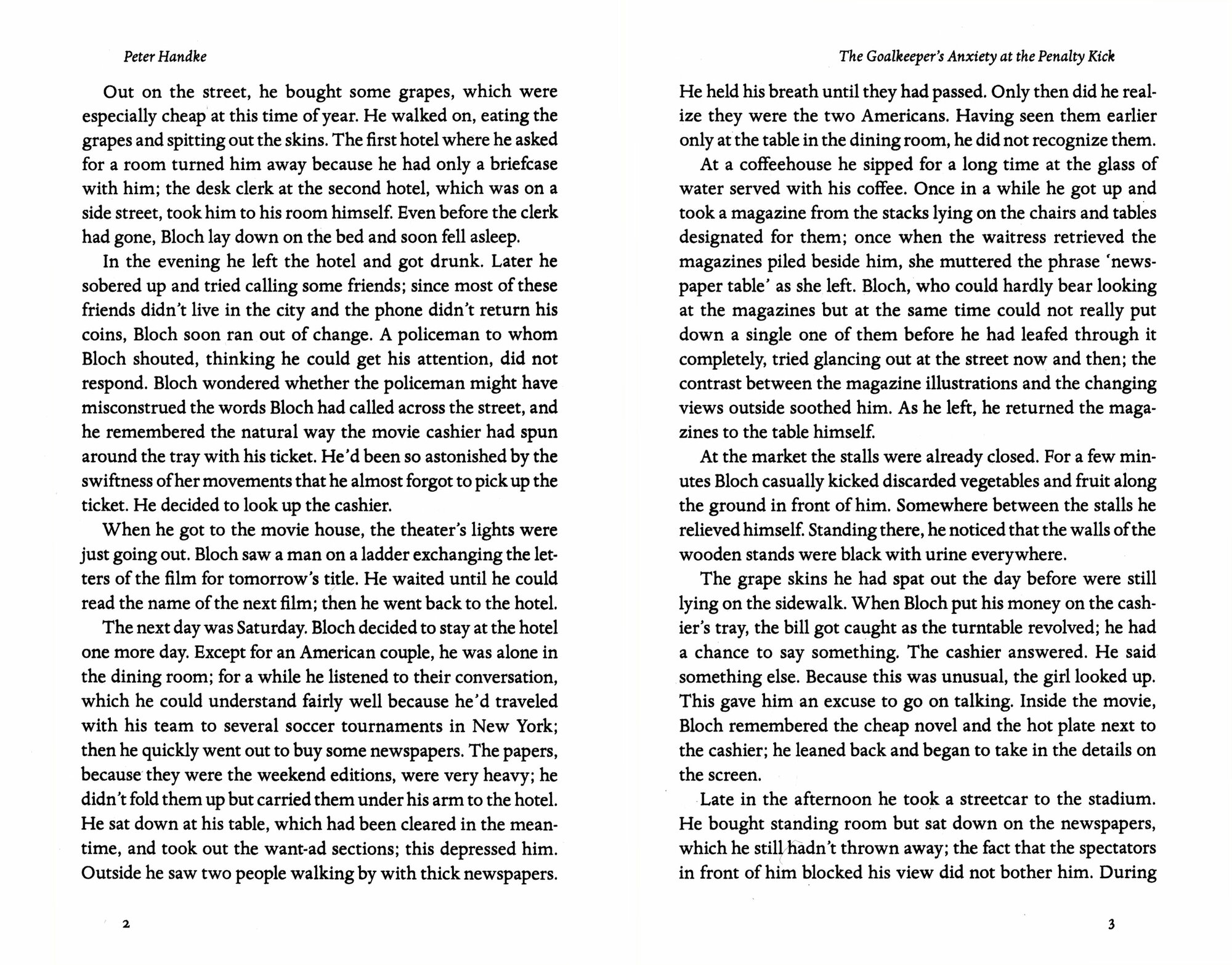 Joseph Bloch, a once-famous goalkeeper turned construction worker, commits a random murder without thought or regret. As he wanders the streets, from hotel to bar, cinema to tram stop, experiencing strange and violent encounters on the way, he finds himself, and everything around him, disintegrating. Told in spare and icy prose, Peter Handke's masterpiece of alienation takes apart our ideas of humanity and reality itself.
