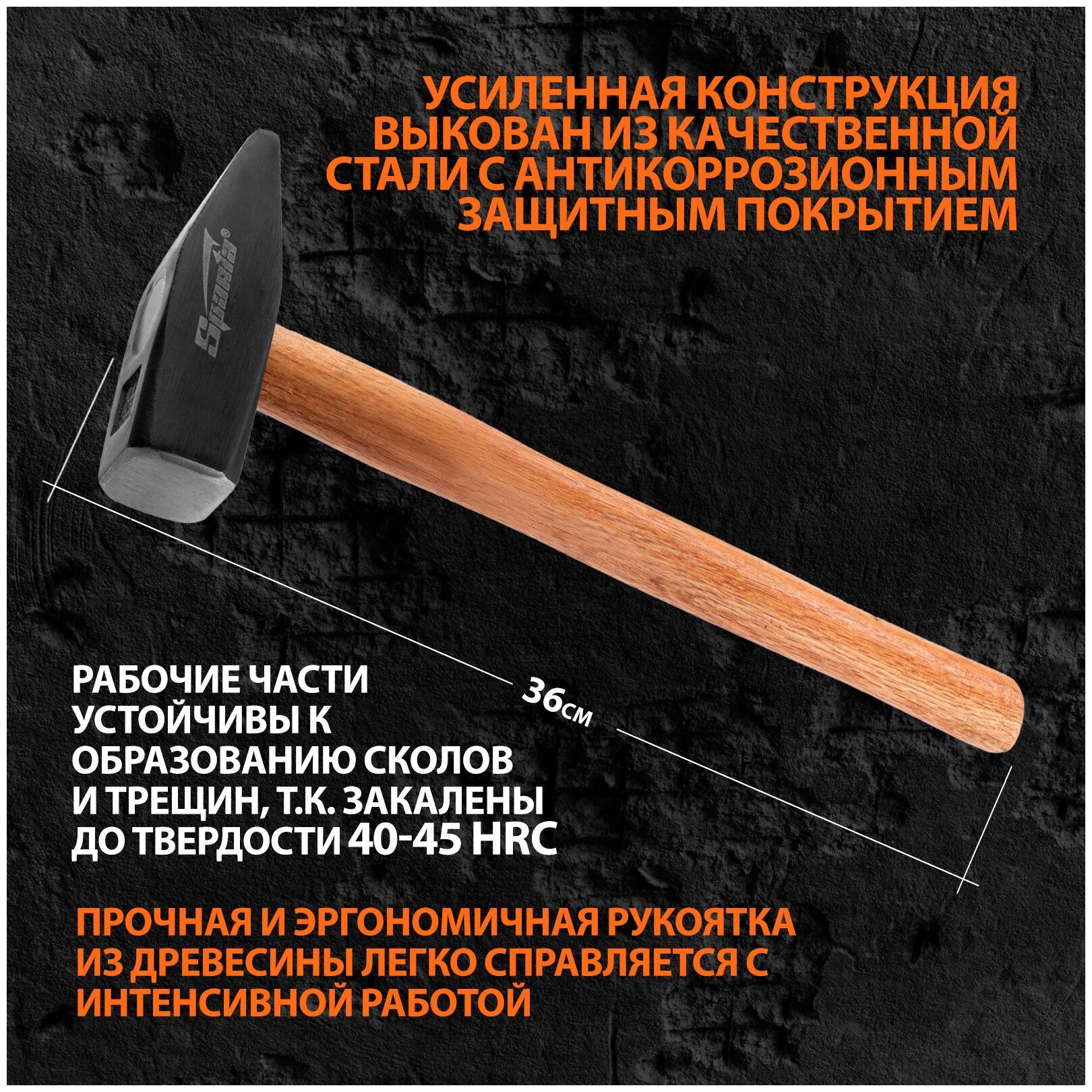 Рабочая часть инструмента покрыта черным лаком и надежно зафиксирована на рукоятке при помощи клина и специального эпоксидного клея. Боек кованый и отфрезерованный. Проведена селективная закалка, обеспечивающая бойку прочность и препятствующая образованию расклепов на его гранях. Деревянная рукоятка c прямым волокном, без сучков, защищена от рассыхания бесцветным лаком.