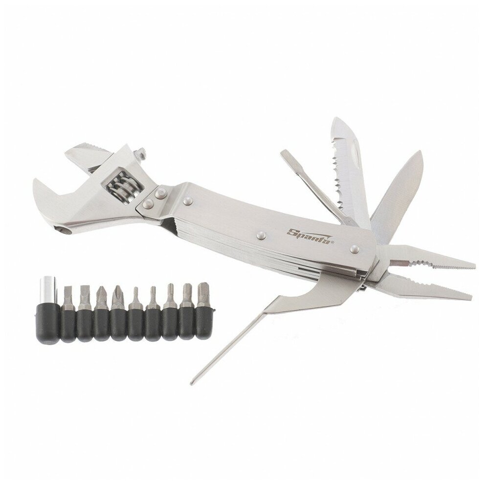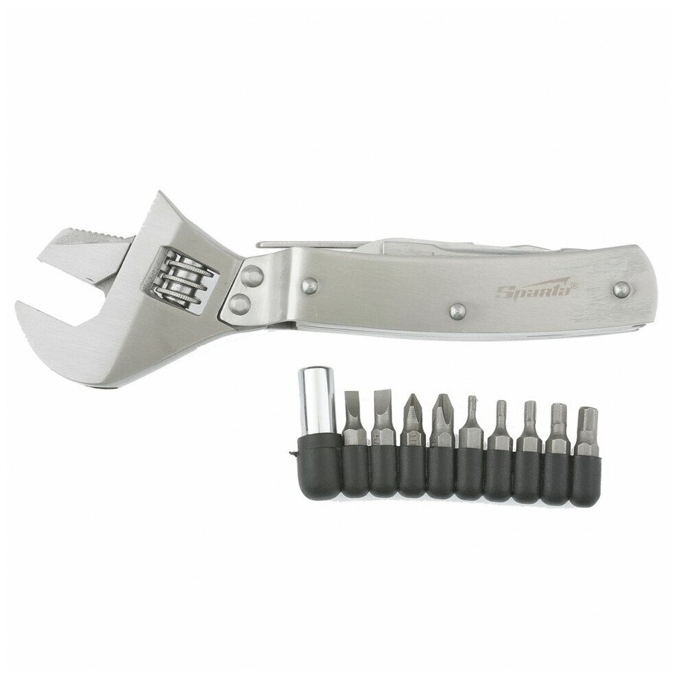 Трансформер Sparta длиной 170 мм включает в себя 8 предметов и позволяет успешно решать самые разные задачи. Ножом можно разрезать веревку или картон, напильником — заточить рыболовный крючок. Многофункциональный набор включает также разводной ключ, пассатижи и биты, необходимые для выполнения слесарных работ. Его можно использовать дома, на даче, в гараже, а также в походе, на охоте или рыбалке.