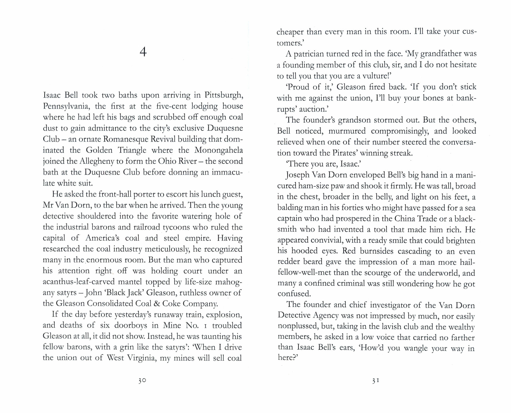 Мне нравится предыстория Айзека Белла. Клайв Касслер в очередной раз дал своим читателям то, что они хотят. По крайней мере, ваш покорный читатель очень рад видеть Айзека неопытным молодым детективом, который учится у лучших сыщиков детективного агентства Ван Дорна. Действие романа происходит в угольной стране в 1902 году. Забастовщики, владельцы, банкиры - все они оказываются во власти тогдашних проблем, связанных с профсоюзами и не профсоюзами… Прокатитесь по Редингской железной дороге или на баржах, курсирующих в районе трех рек, и вы найдете волнение, страх и сомнительных персонажей на любой странице, которую вы выберете…