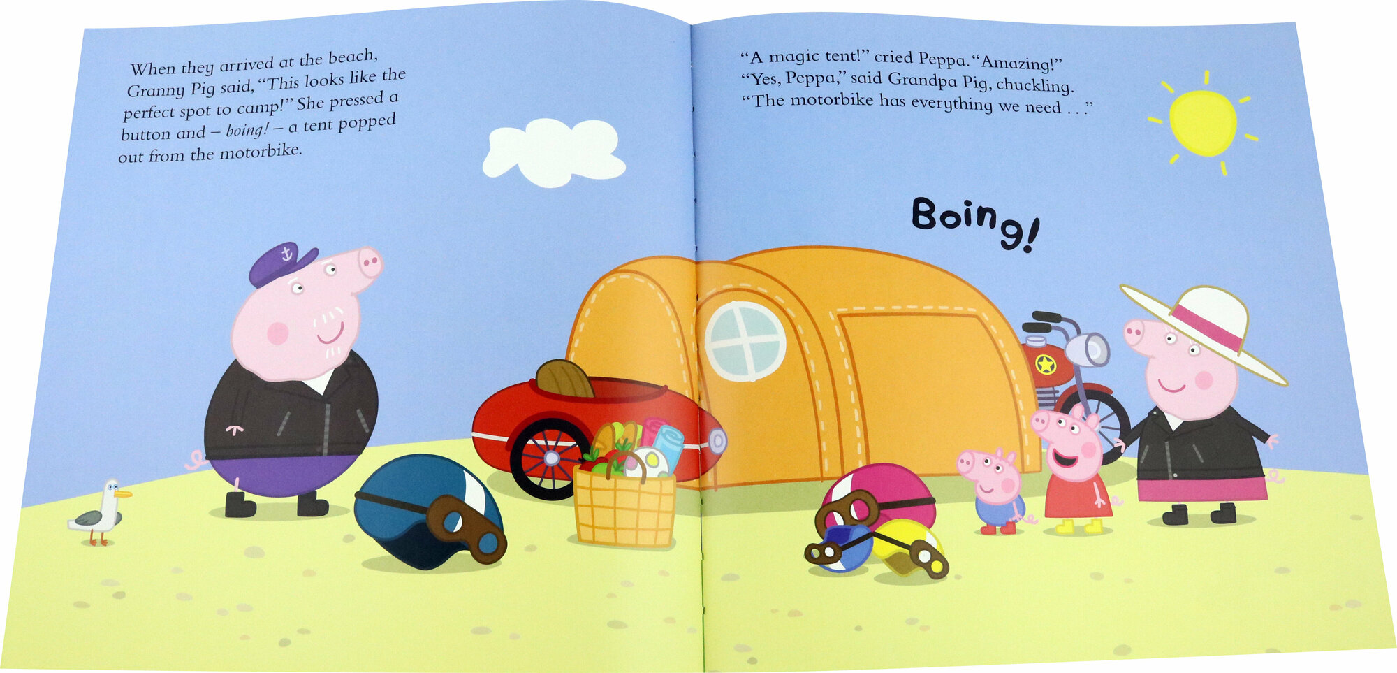 Peppa and George are visiting Granny and Grandpa Pig when they decide to go on a camping adventure. It's time to dust off the old motorbike and sidecar and head to the beach!