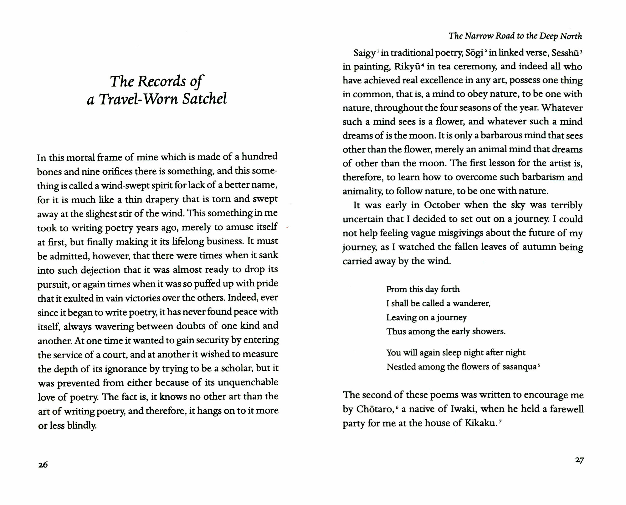 In his perfectly crafted haiku poems, Basho described the natural world with great simplicity and delicacy of feeling. When he composed The Narrow Road to the Deep North he was a serious student of Zen Buddhism setting off on a series of travels designed to strip away the trappings of the material world and bring spiritual enlightenment. He wrote of the seasons changing, of the smell of the rain, the brightness of the moon and the beauty of the waterfall, through which he sensed the mysteries of the universe. These travel writings not only chronicle Basho's perilous journeys through Japan, but also capture his vision of eternity in the transient world around him.