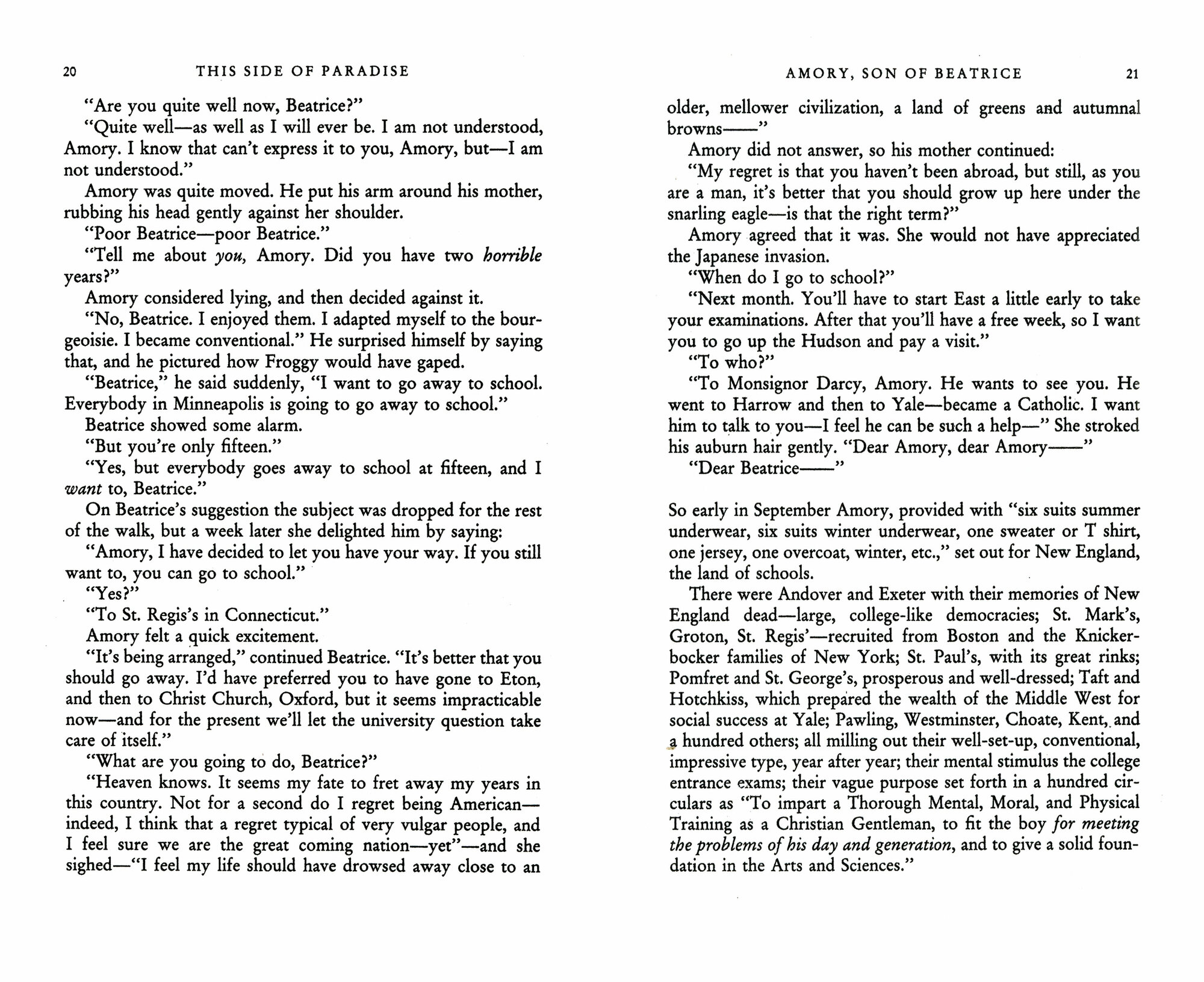 Amory Blaine, intent on rebelling against his staid, Midwestern upbringing, longs to acquire the patina of Eastern sophistication. In his quest for sexual and intellectual enlightenment, he progresses through a series of relationships, until he is cast out into the real world.