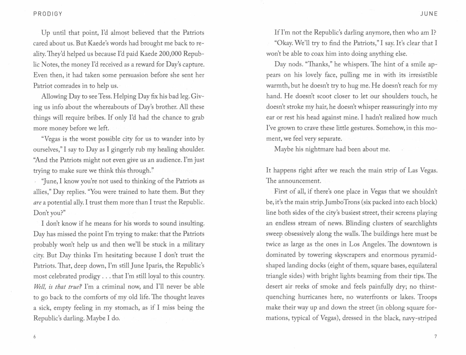 Injured and on the run, it has been seven days since June and Day barely escaped Los Angeles and the Republic with their lives. Day is believed dead having lost his own brother to an execution squad who thought they were assassinating him. June is now the Republic's most wanted traitor.