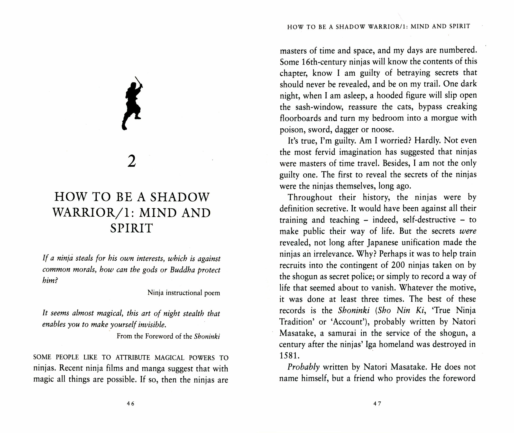 The Ninjas today are the stuff of myth and legend in comics, film and electronic games. But once they were real, the medieval equivalent of the SAS: spies, saboteurs, assassins. In their secrecy, under-cover skills and determination to survive, they were the opposite of the overt, self destructive samurai. Could they fly? Make themselves invisible? Of course not.It was just that their skills gave them a magical aura. As a result, martial artists and story-tellers have turned them into fantasy creatures, from James Bond to Mutant Turtles.