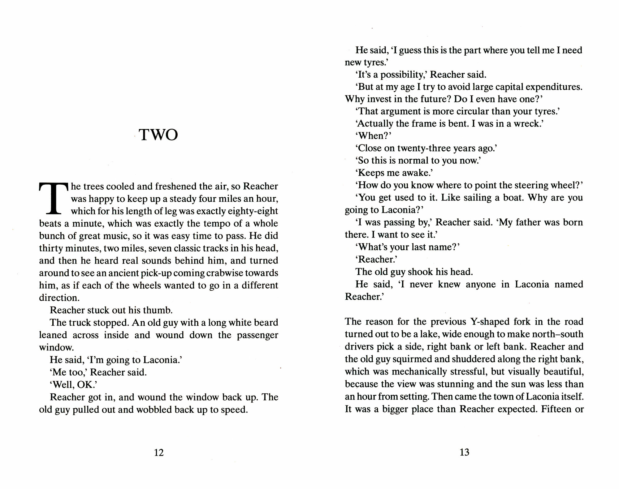 Meanwhile, Jack Reacher sets out on an epic road trip across America. He doesn't get far. Deep in the New England woods, he sees a sign to a place he has never been - the town where his father was born. But when he arrives he is told no one named Reacher ever lived there. Now he wonders: who's lying?